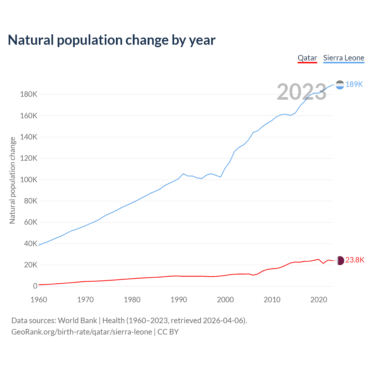 Qatar has an annual birth rate of 9.91 births per 1,000 people, compared to 30.6 for Sierra Leone. The average number of children a woman is expected to have during her lifetime — the fertility rate, is 1.73 in Qatar and 3.79 in Sierra Leone — 119.3% difference.