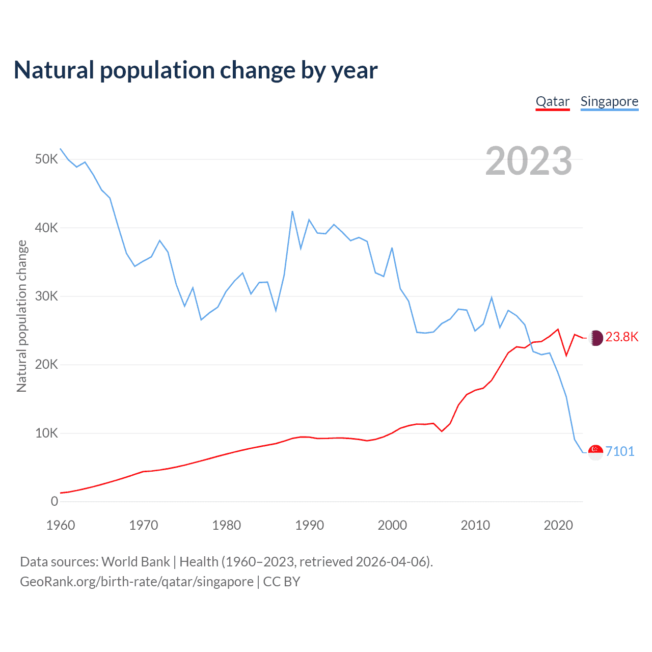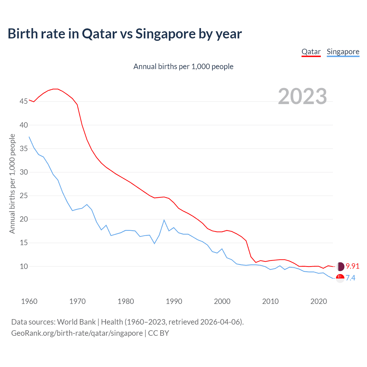 Qatar has an annual birth rate of 9.91 births per 1,000 people, compared to 7.4 for Singapore. The average number of children a woman is expected to have during her lifetime — the fertility rate, is 1.73 in Qatar and 0.97 in Singapore — 43.9% difference.