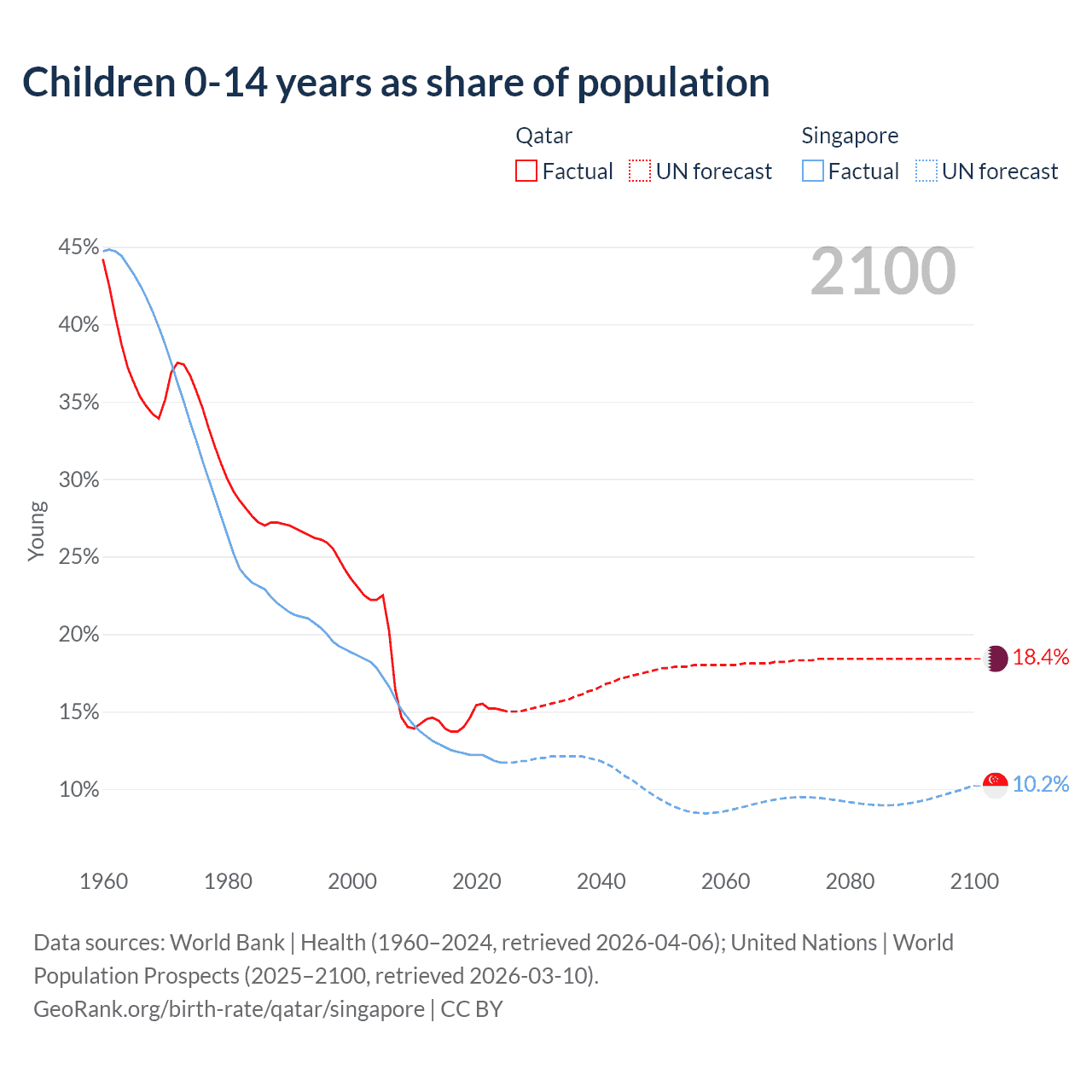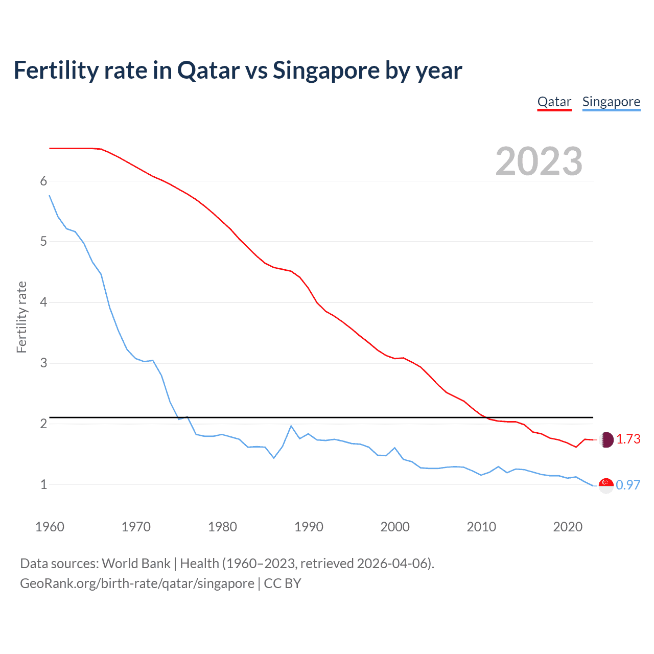 According to the latest available data on birth rates, the fertility rate in Qatar was 1.73 children per woman in 2023, compared to 0.97 in Singapore in 2023. The replacement level is considered to be 2.1 children per woman.