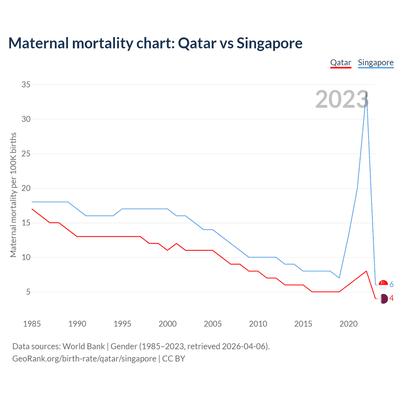 The maternal mortality rate, which is the probability of dying during childbirth or within 42 days of pregnancy termination, is 4 deaths per 100,000 live births in Qatar, compared to 6 deaths in Singapore.