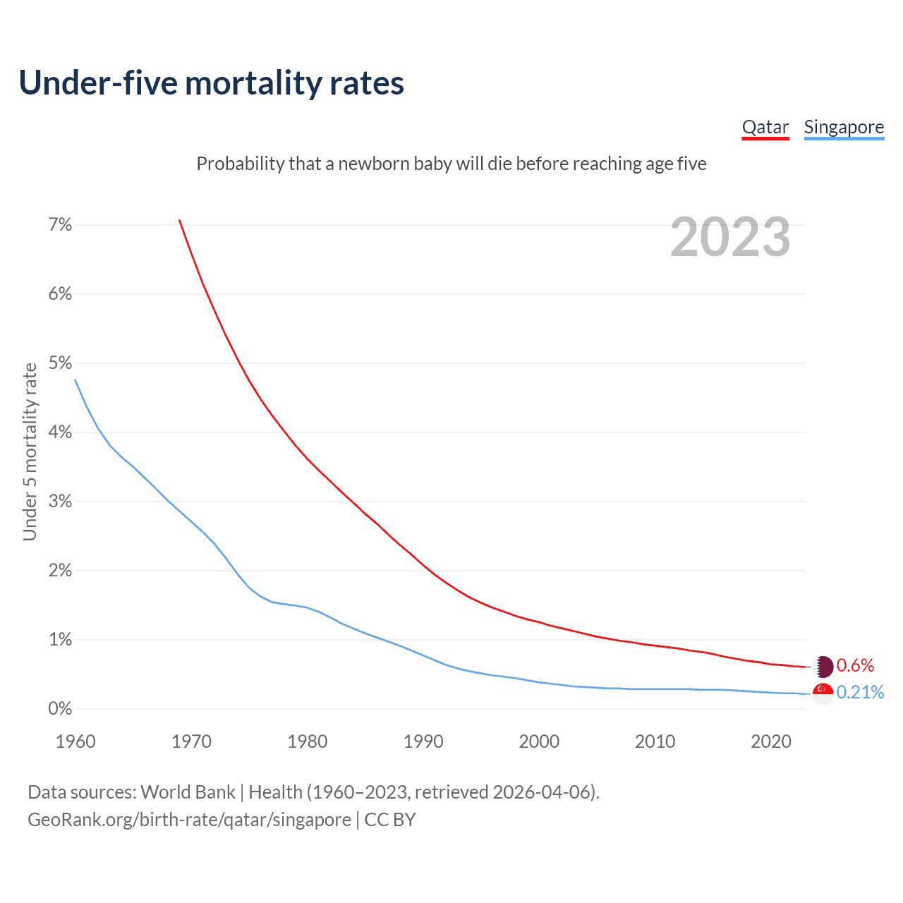 The chance that a newborn baby will die before reaching age five is 0.6% in Qatar and 0.21% in Singapore. Above is a chart with historical data on under-five mortality rates.