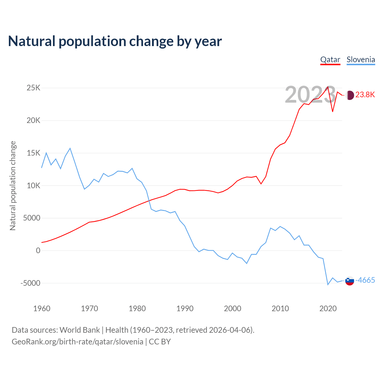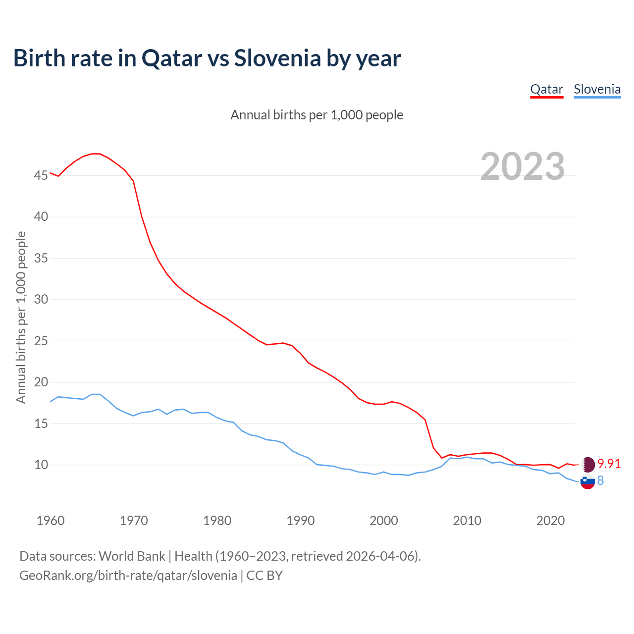 Qatar has an annual birth rate of 9.91 births per 1,000 people, compared to 8 for Slovenia. The average number of children a woman is expected to have during her lifetime — the fertility rate, is 1.73 in Qatar and 1.51 in Slovenia — 12.7% difference.