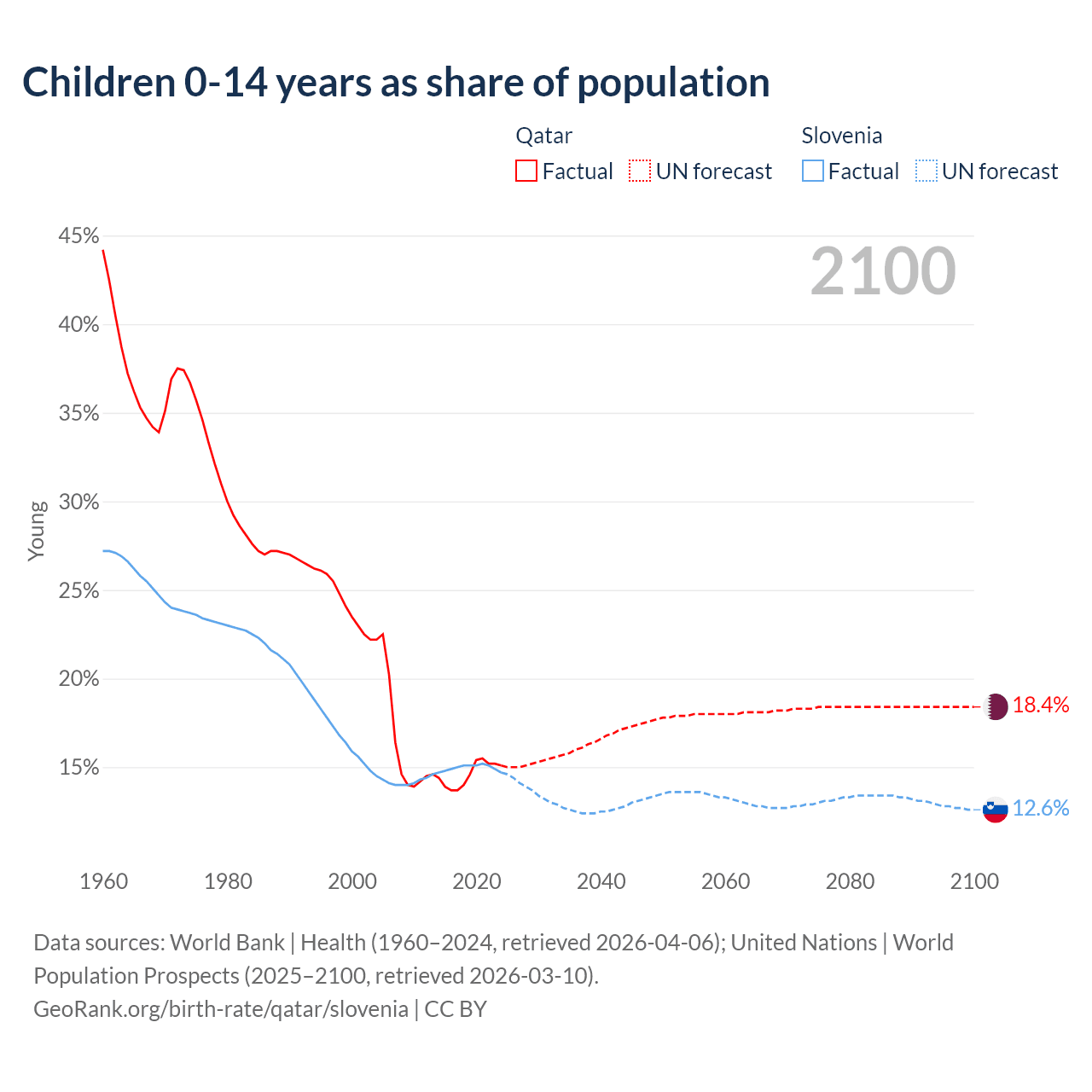 According to the latest available data on birth rates, the fertility rate in Qatar was 1.73 children per woman in 2023, compared to 1.51 in Slovenia in 2023. The replacement level is considered to be 2.1 children per woman.