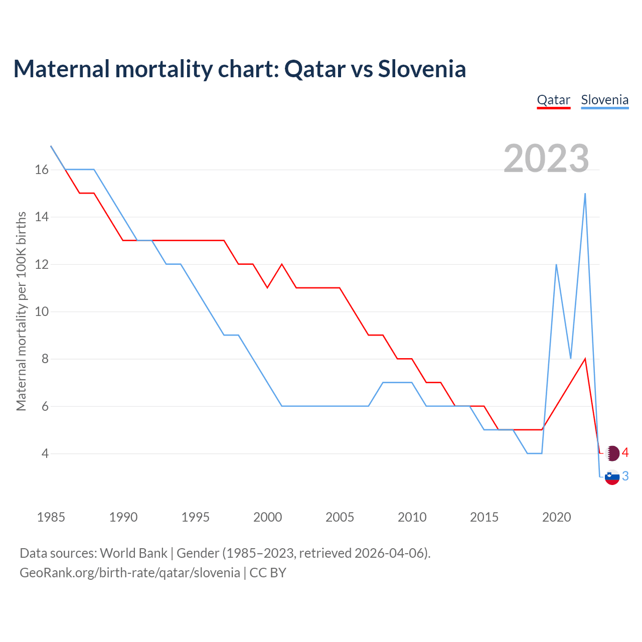The maternal mortality rate, which is the probability of dying during childbirth or within 42 days of pregnancy termination, is 4 deaths per 100,000 live births in Qatar, compared to 3 deaths in Slovenia.