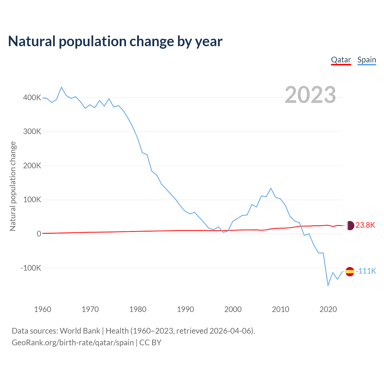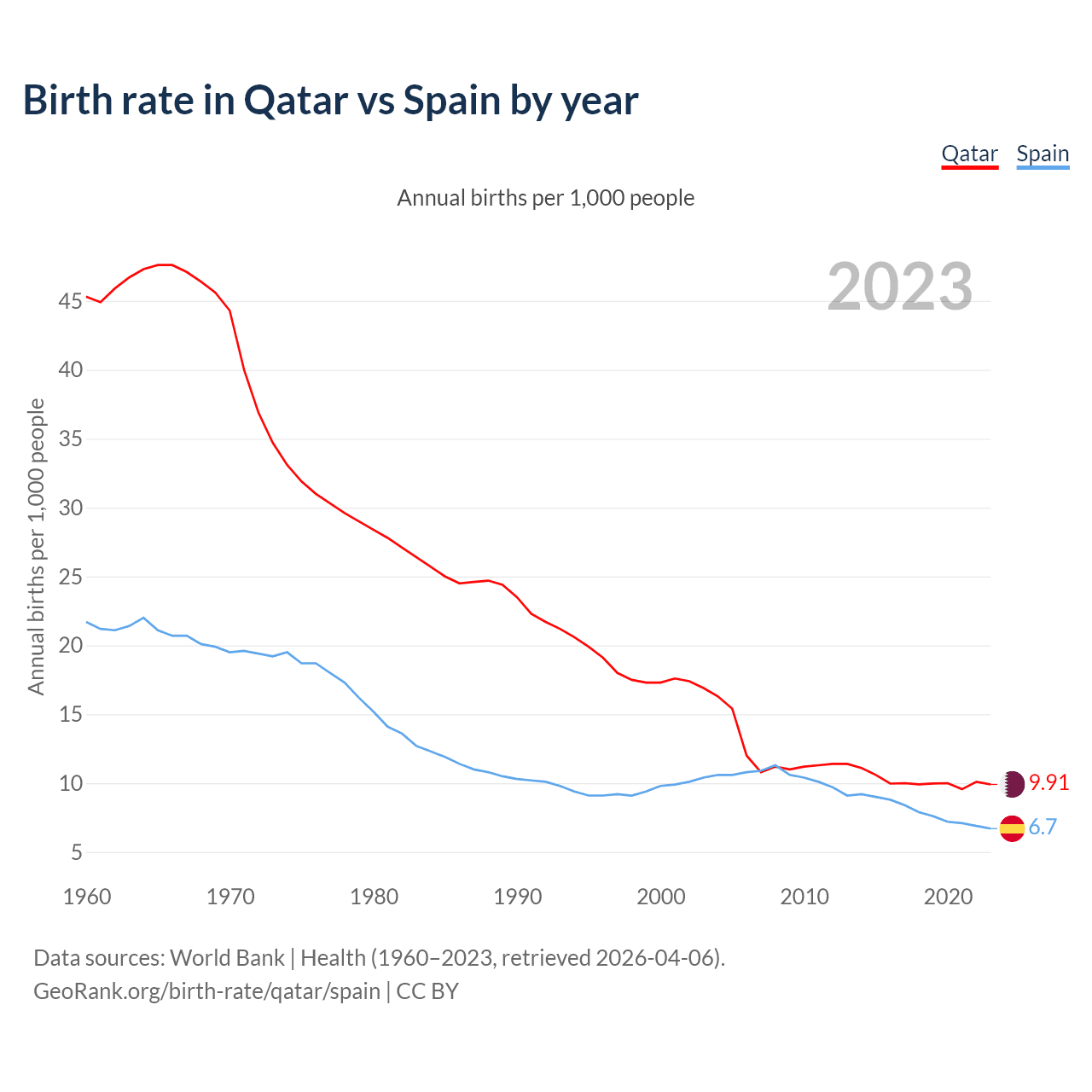 According to the latest available data on birth rates, the fertility rate in Qatar was 1.73 children per woman in 2023, compared to 1.12 in Spain in 2023. The replacement level is considered to be 2.1 children per woman.