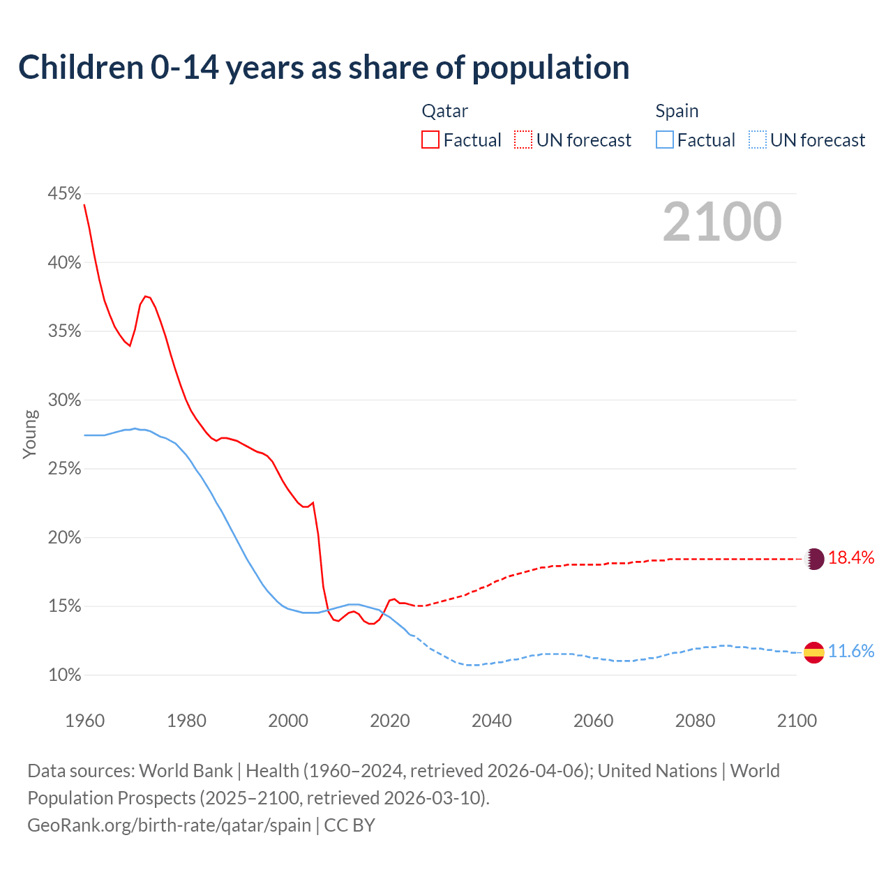 Qatar has an annual birth rate of 9.91 births per 1,000 people, compared to 6.7 for Spain. The average number of children a woman is expected to have during her lifetime — the fertility rate, is 1.73 in Qatar and 1.12 in Spain — 35.2% difference.
