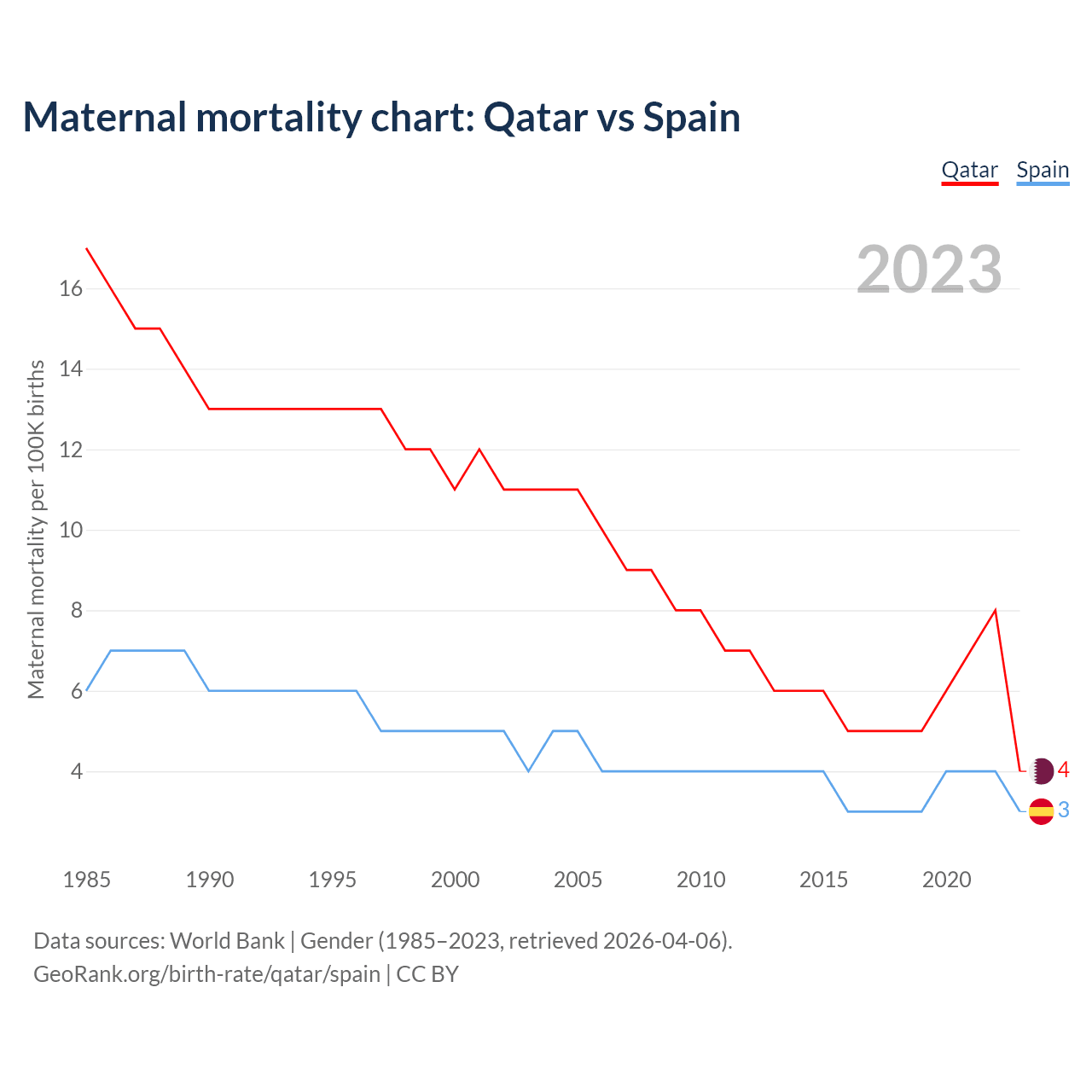 The maternal mortality rate, which is the probability of dying during childbirth or within 42 days of pregnancy termination, is 4 deaths per 100,000 live births in Qatar, compared to 3 deaths in Spain.