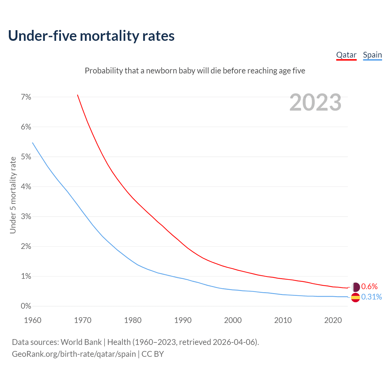The chance that a newborn baby will die before reaching age five is 0.6% in Qatar and 0.31% in Spain. Above is a chart with historical data on under-five mortality rates.