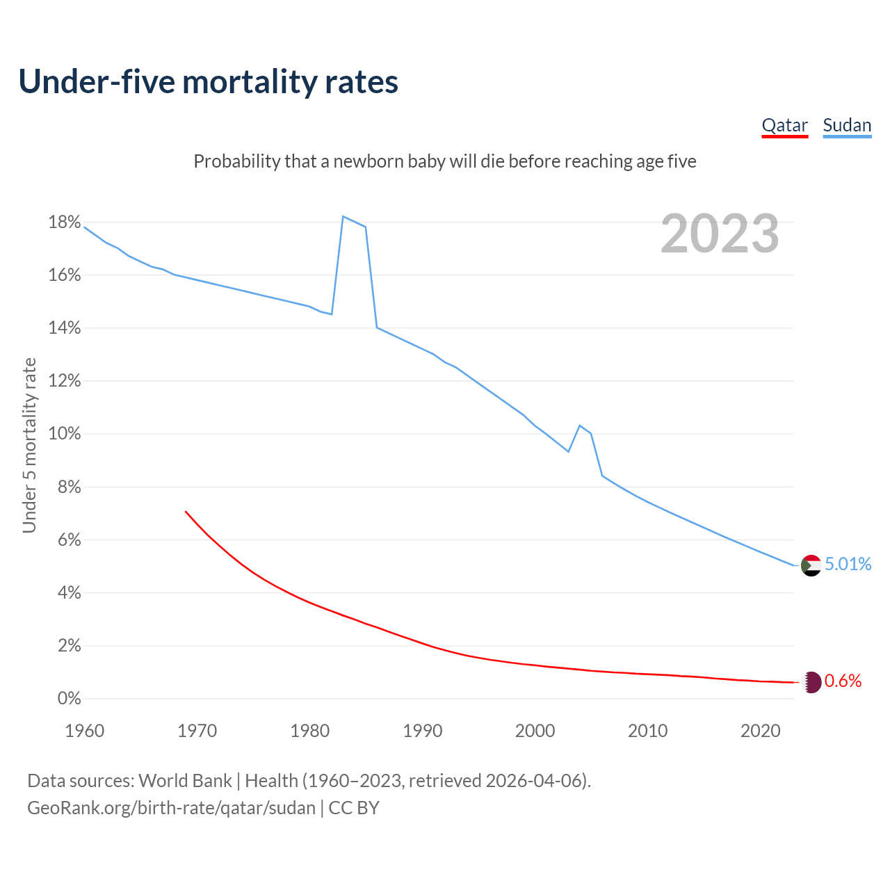 The chance that a newborn baby will die before reaching age five is 0.6% in Qatar and 5.01% in Sudan. Above is a chart with historical data on under-five mortality rates.