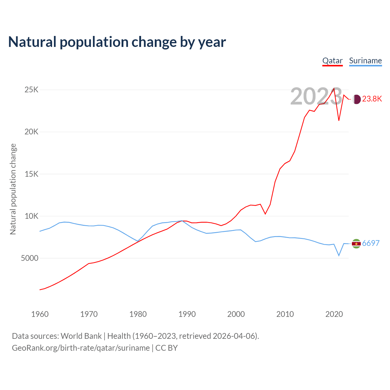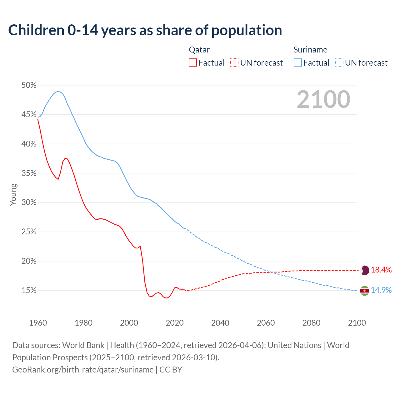 According to the latest available data on birth rates, the fertility rate in Qatar was 1.73 children per woman in 2023, compared to 2.25 in Suriname in 2023. The replacement level is considered to be 2.1 children per woman.
