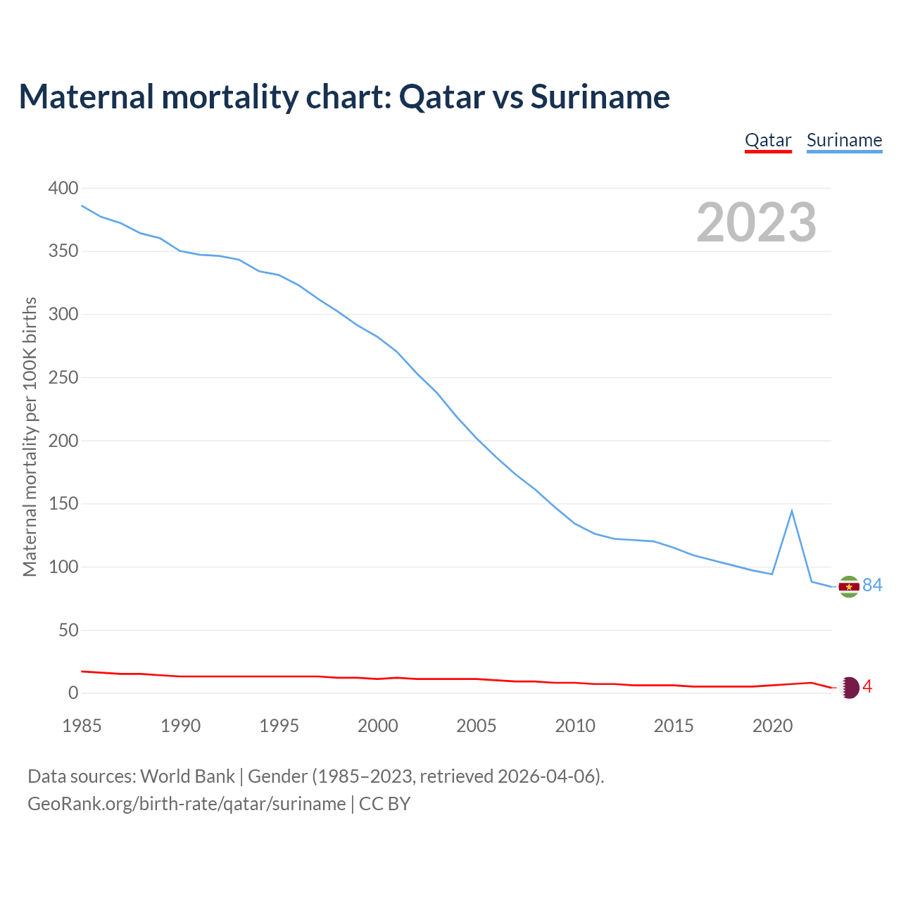 The maternal mortality rate, which is the probability of dying during childbirth or within 42 days of pregnancy termination, is 4 deaths per 100,000 live births in Qatar, compared to 84 deaths in Suriname.