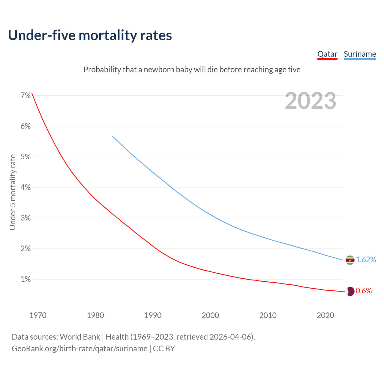 The chance that a newborn baby will die before reaching age five is 0.6% in Qatar and 1.62% in Suriname. Above is a chart with historical data on under-five mortality rates.