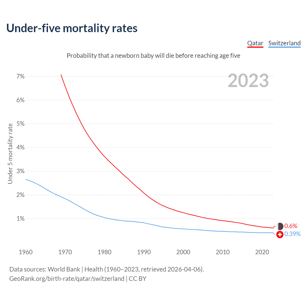 The chance that a newborn baby will die before reaching age five is 0.6% in Qatar and 0.39% in Switzerland. Above is a chart with historical data on under-five mortality rates.