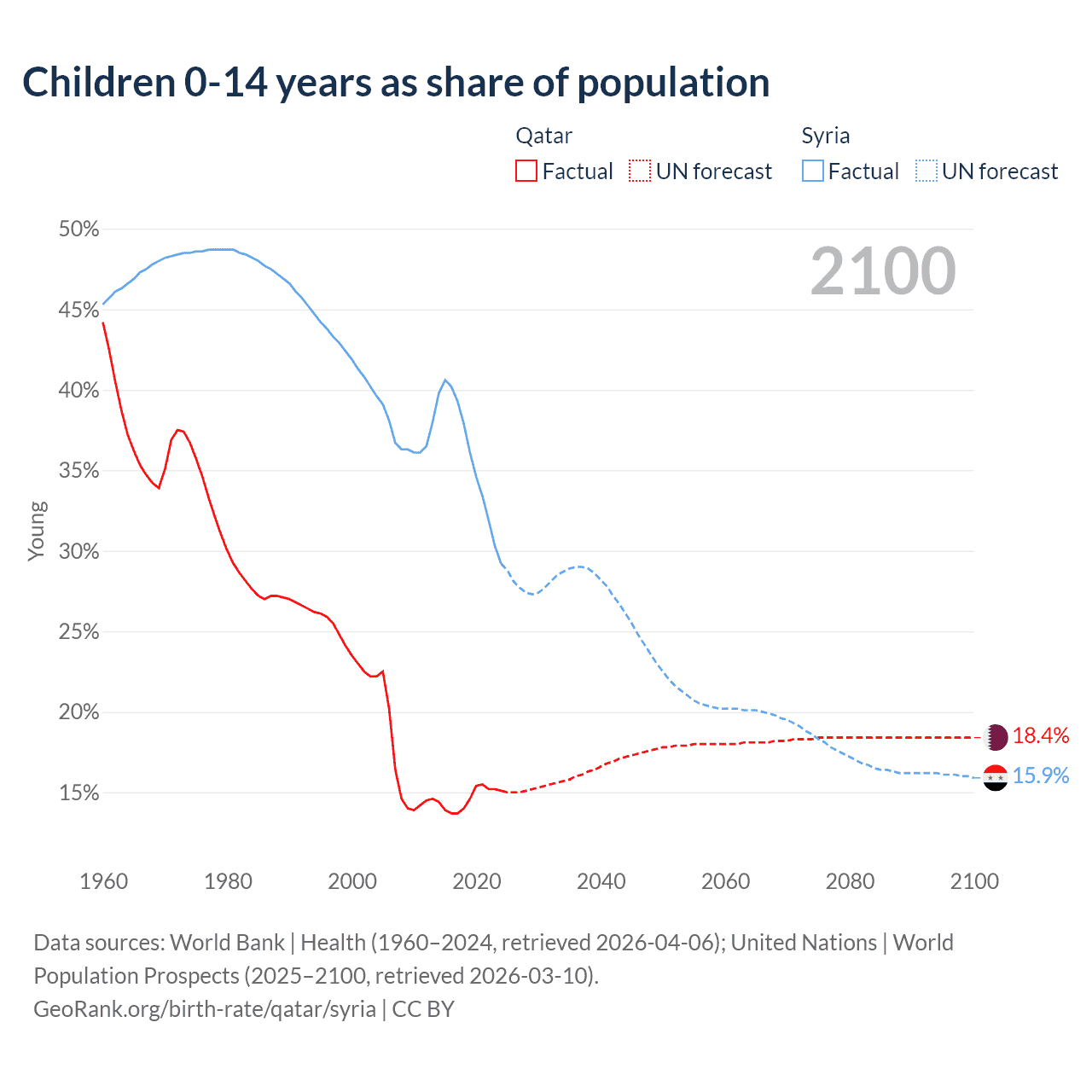 Qatar has an annual birth rate of 9.91 births per 1,000 people, compared to 22.1 for Syria. The average number of children a woman is expected to have during her lifetime — the fertility rate, is 1.73 in Qatar and 2.71 in Syria — 56.9% difference.