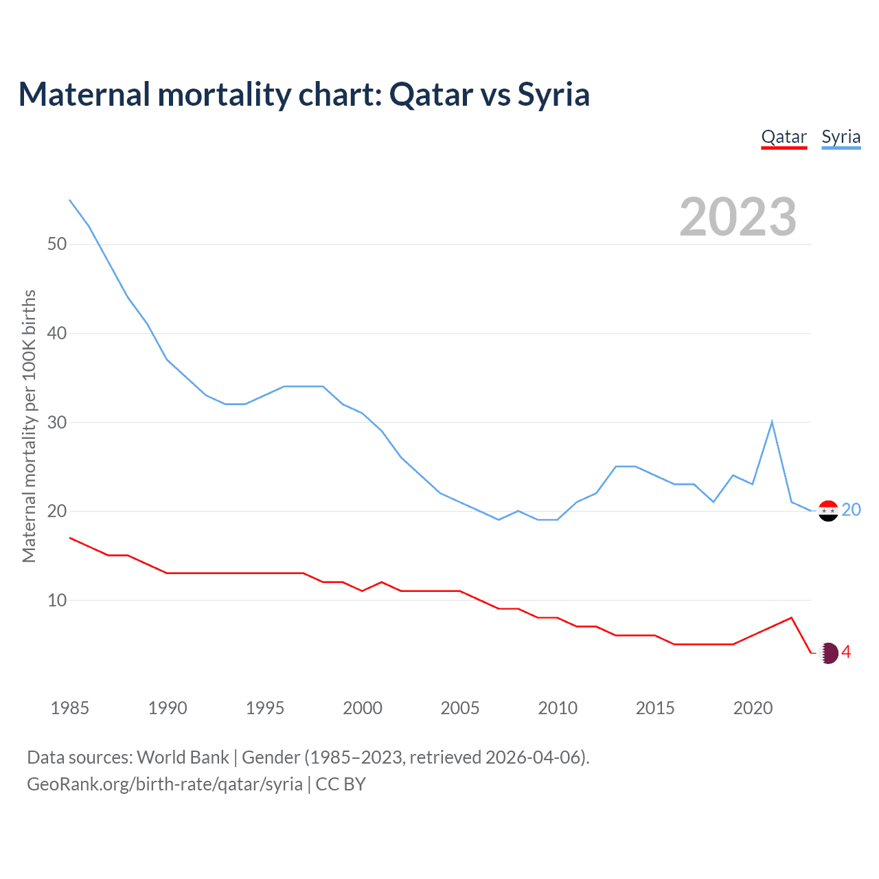 The maternal mortality rate, which is the probability of dying during childbirth or within 42 days of pregnancy termination, is 4 deaths per 100,000 live births in Qatar, compared to 20 deaths in Syria.