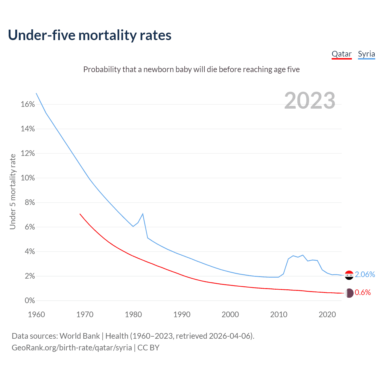 The chance that a newborn baby will die before reaching age five is 0.6% in Qatar and 2.06% in Syria. Above is a chart with historical data on under-five mortality rates.