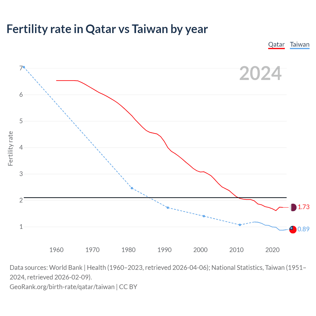 According to the latest available data on birth rates, the fertility rate in Qatar was 1.73 children per woman in 2023, compared to 0.89 in Taiwan in 2024. The replacement level is considered to be 2.1 children per woman.