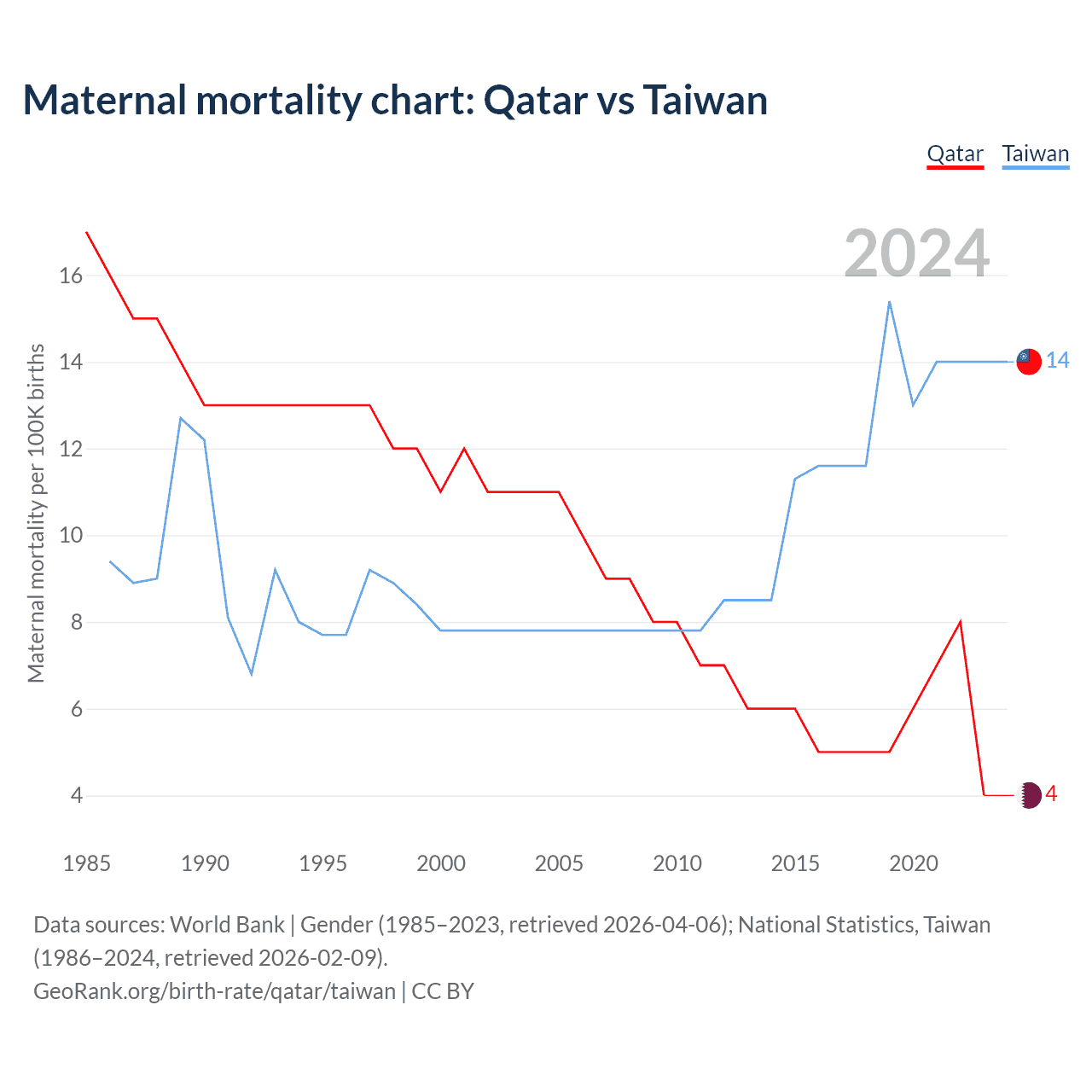 The maternal mortality rate, which is the probability of dying during childbirth or within 42 days of pregnancy termination, is 4 deaths per 100,000 live births in Qatar, compared to 14 deaths in Taiwan.