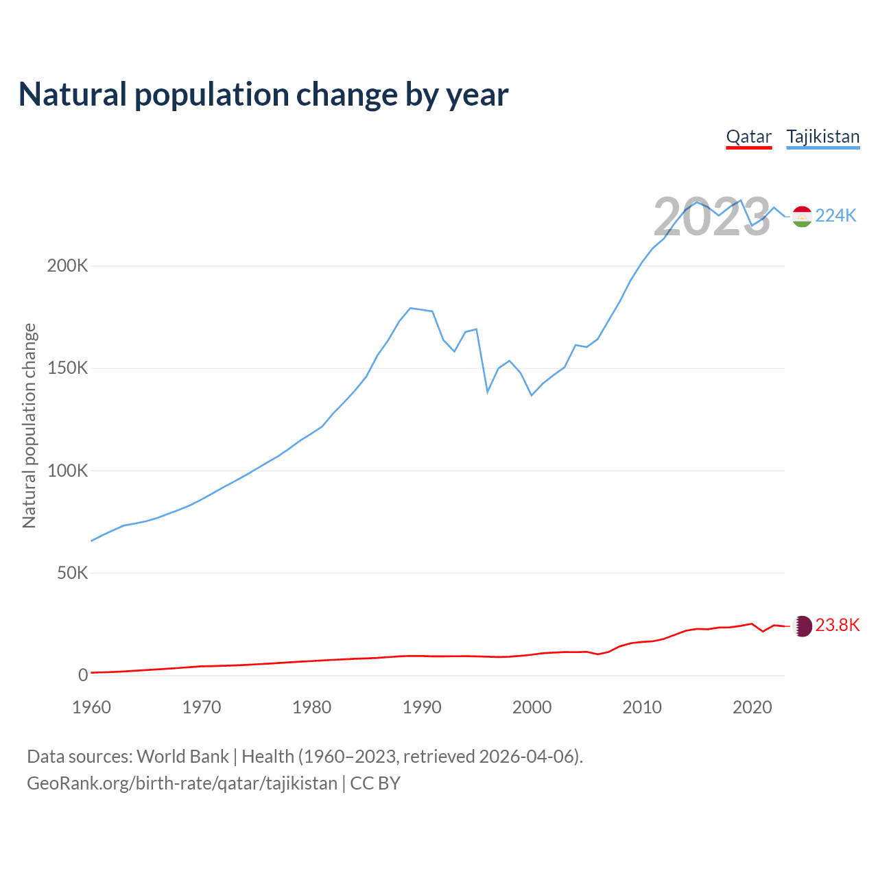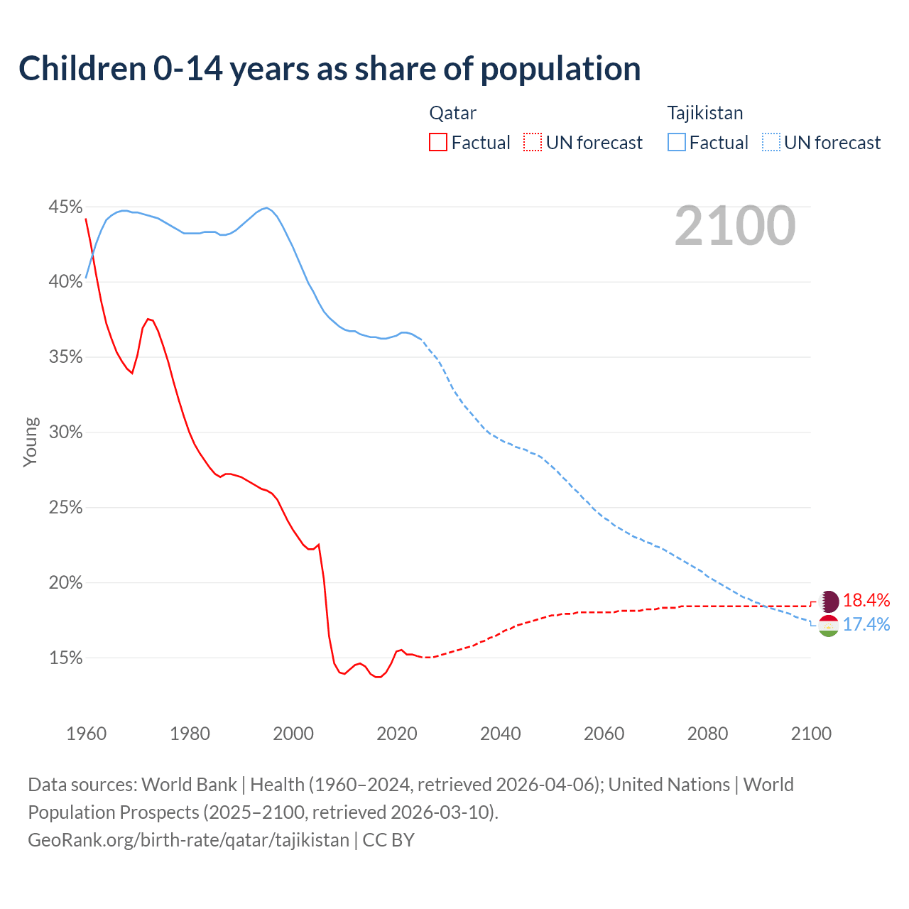 Qatar has an annual birth rate of 9.91 births per 1,000 people, compared to 26.1 for Tajikistan. The average number of children a woman is expected to have during her lifetime — the fertility rate, is 1.73 in Qatar and 3.07 in Tajikistan — 77.7% difference.