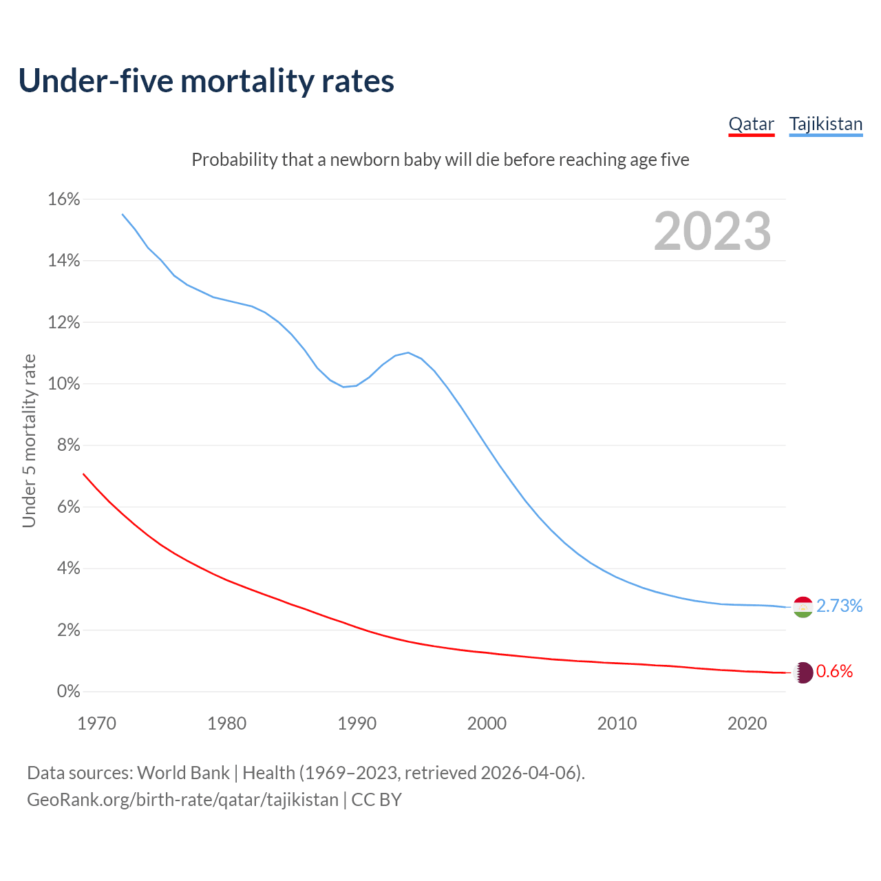 The chance that a newborn baby will die before reaching age five is 0.6% in Qatar and 2.73% in Tajikistan. Above is a chart with historical data on under-five mortality rates.