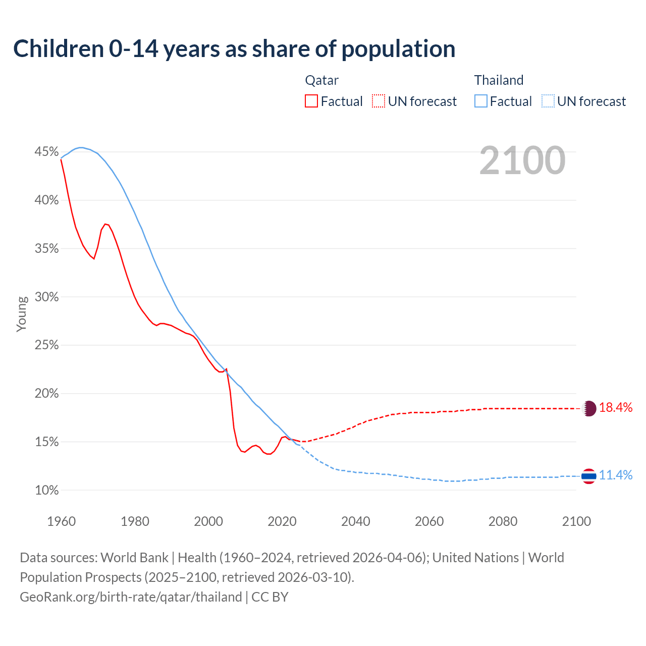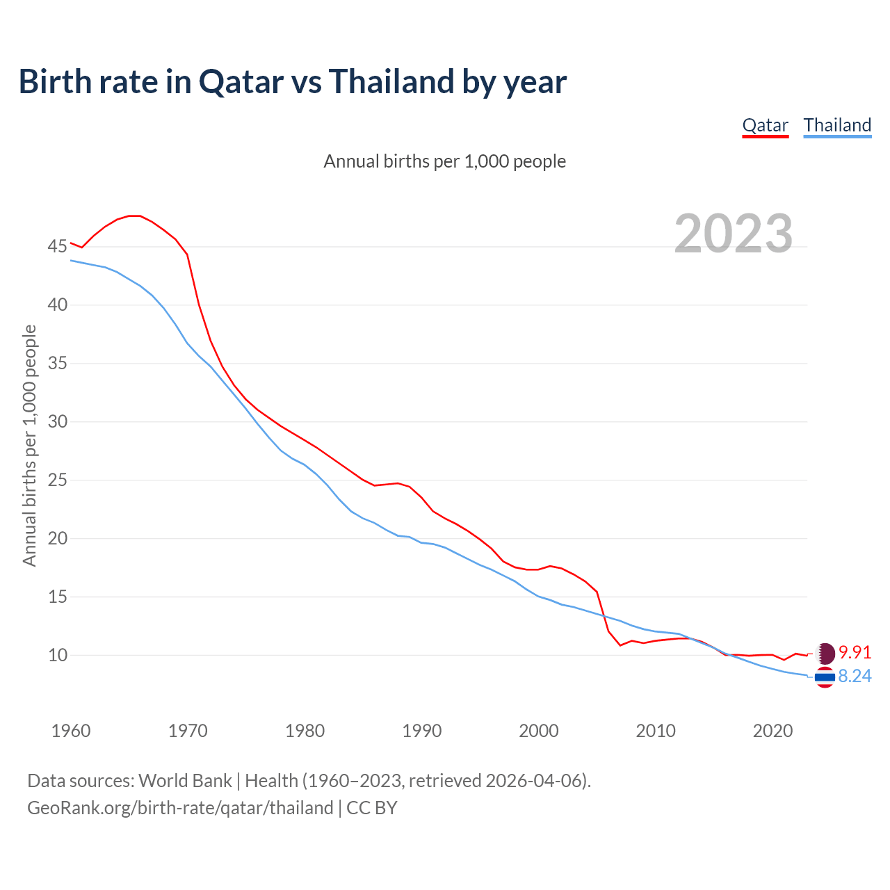 According to the latest available data on birth rates, the fertility rate in Qatar was 1.73 children per woman in 2023, compared to 1.21 in Thailand in 2023. The replacement level is considered to be 2.1 children per woman.