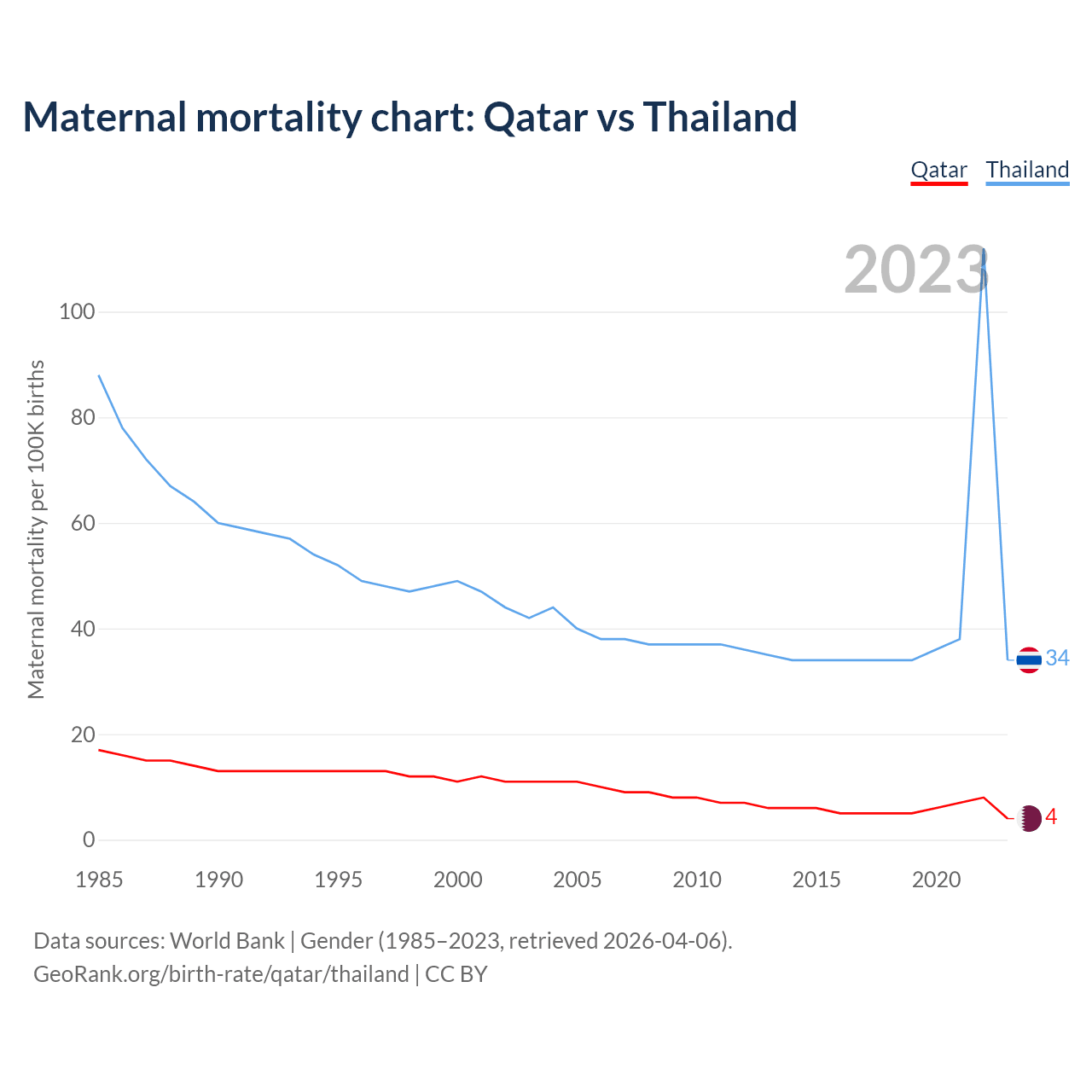 The maternal mortality rate, which is the probability of dying during childbirth or within 42 days of pregnancy termination, is 4 deaths per 100,000 live births in Qatar, compared to 34 deaths in Thailand.