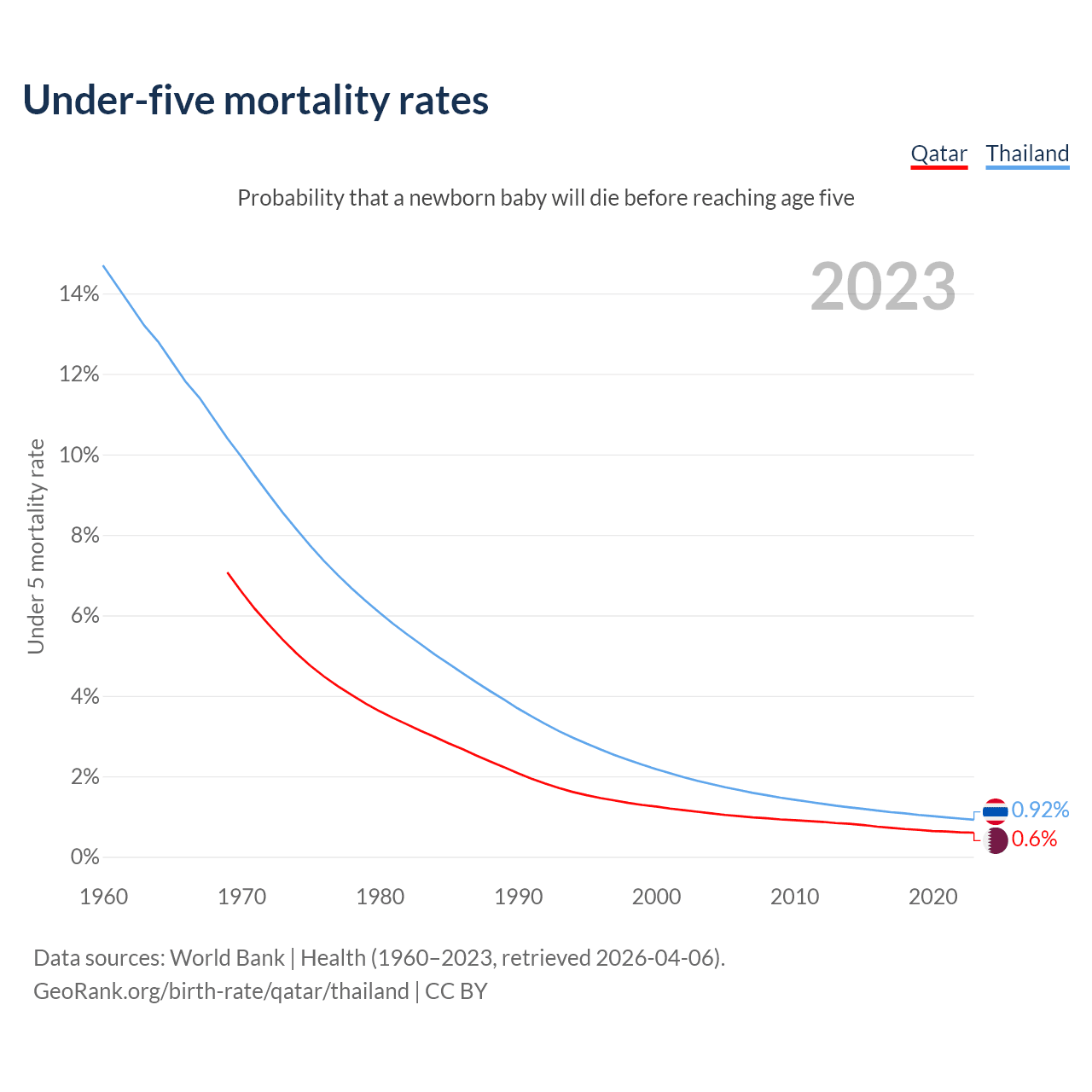 The chance that a newborn baby will die before reaching age five is 0.6% in Qatar and 0.92% in Thailand. Above is a chart with historical data on under-five mortality rates.