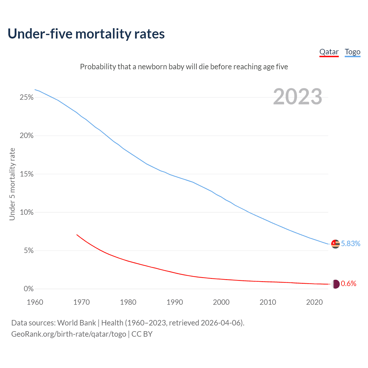 The chance that a newborn baby will die before reaching age five is 0.6% in Qatar and 5.83% in Togo. Above is a chart with historical data on under-five mortality rates.