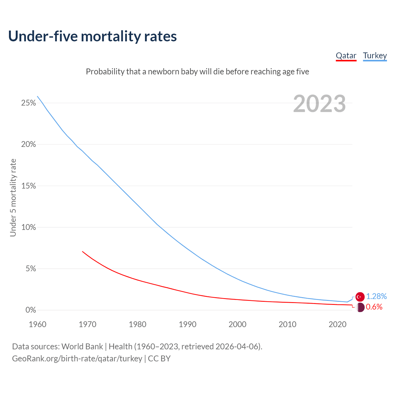 The chance that a newborn baby will die before reaching age five is 0.6% in Qatar and 1.28% in Turkey. Above is a chart with historical data on under-five mortality rates.
