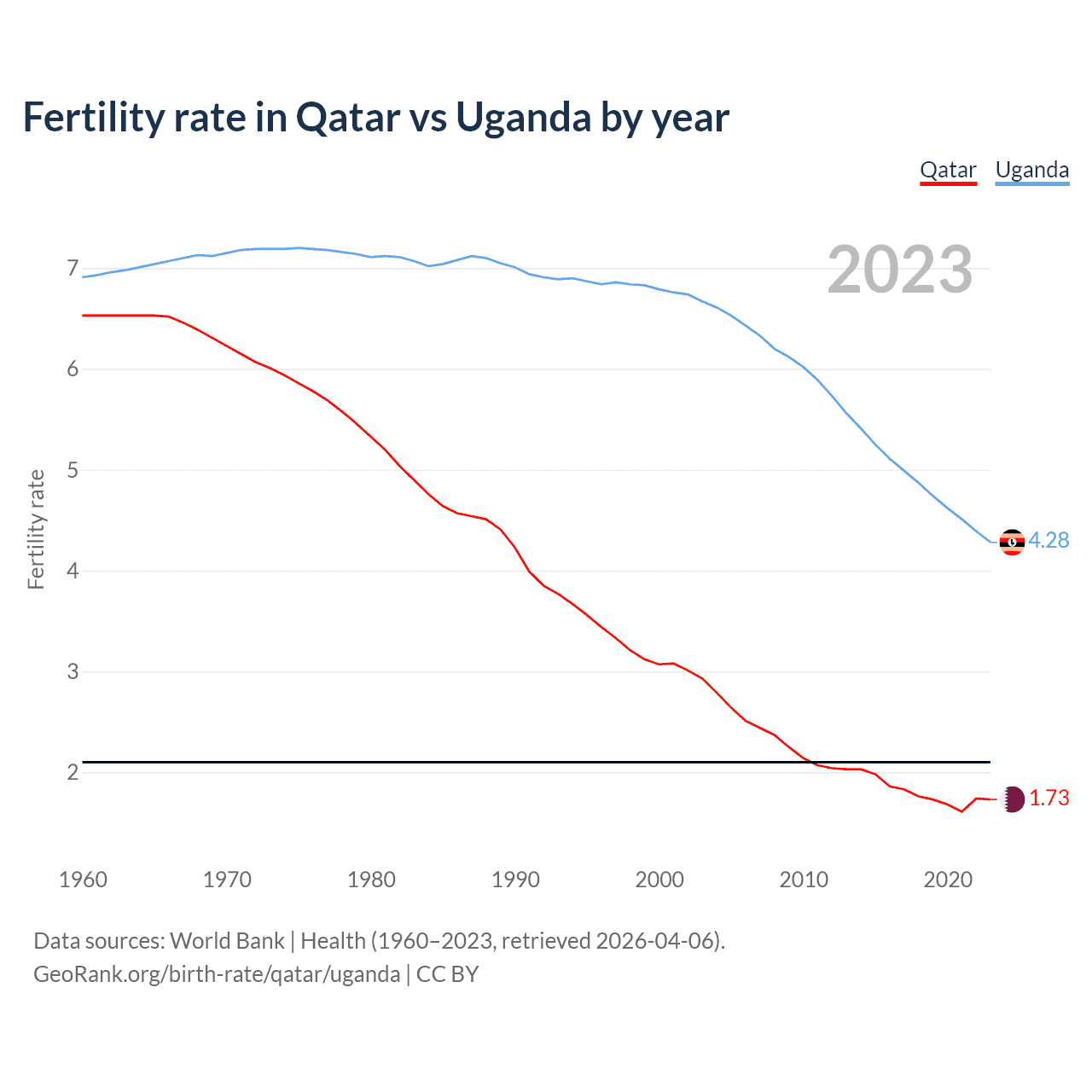 1960 vs 2023, the fertility rate has decreased by 73.5% in Qatar and by 38% in Uganda — in 1960, it was 6.53 and 6.91, respectively.