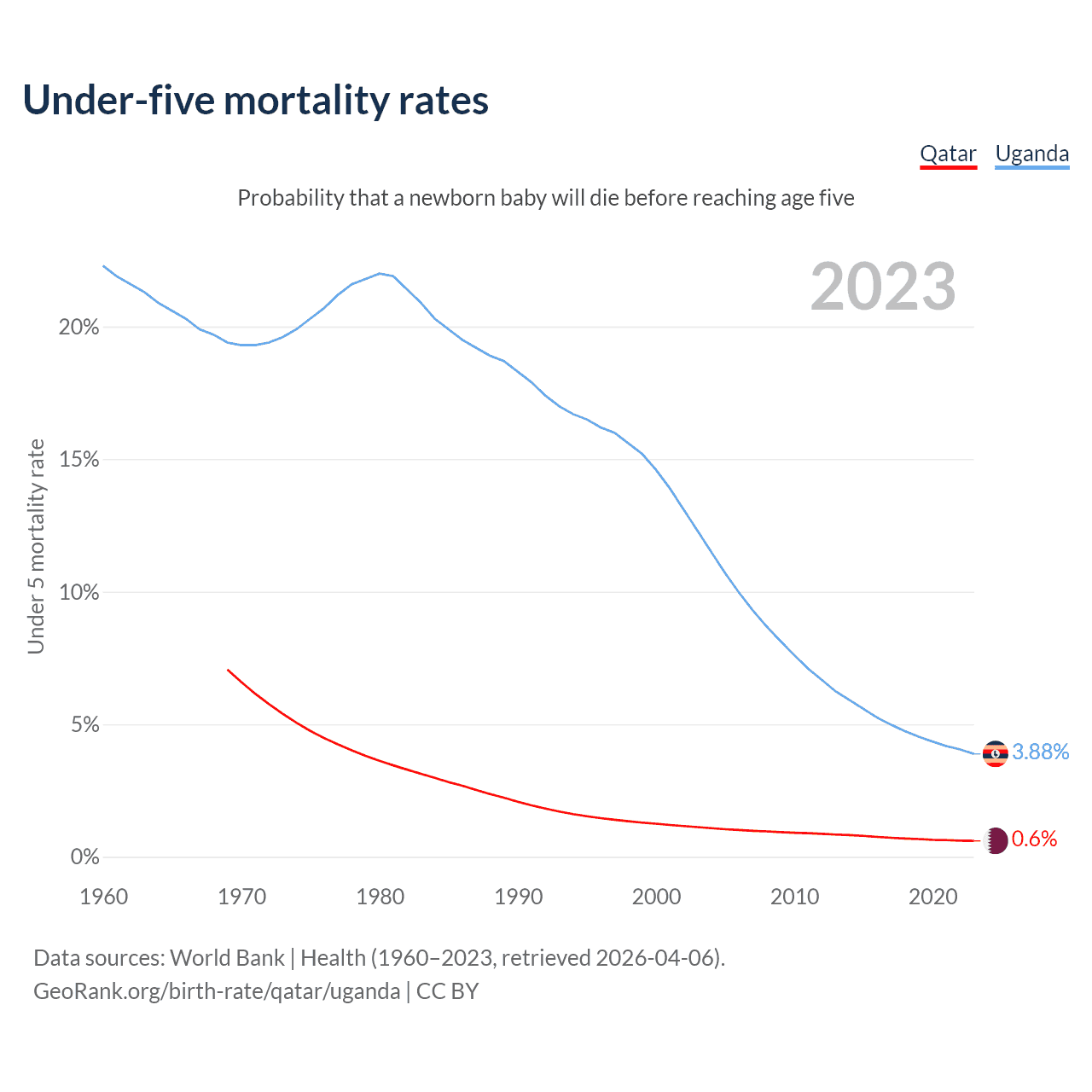 The chance that a newborn baby will die before reaching age five is 0.6% in Qatar and 3.88% in Uganda. Above is a chart with historical data on under-five mortality rates.