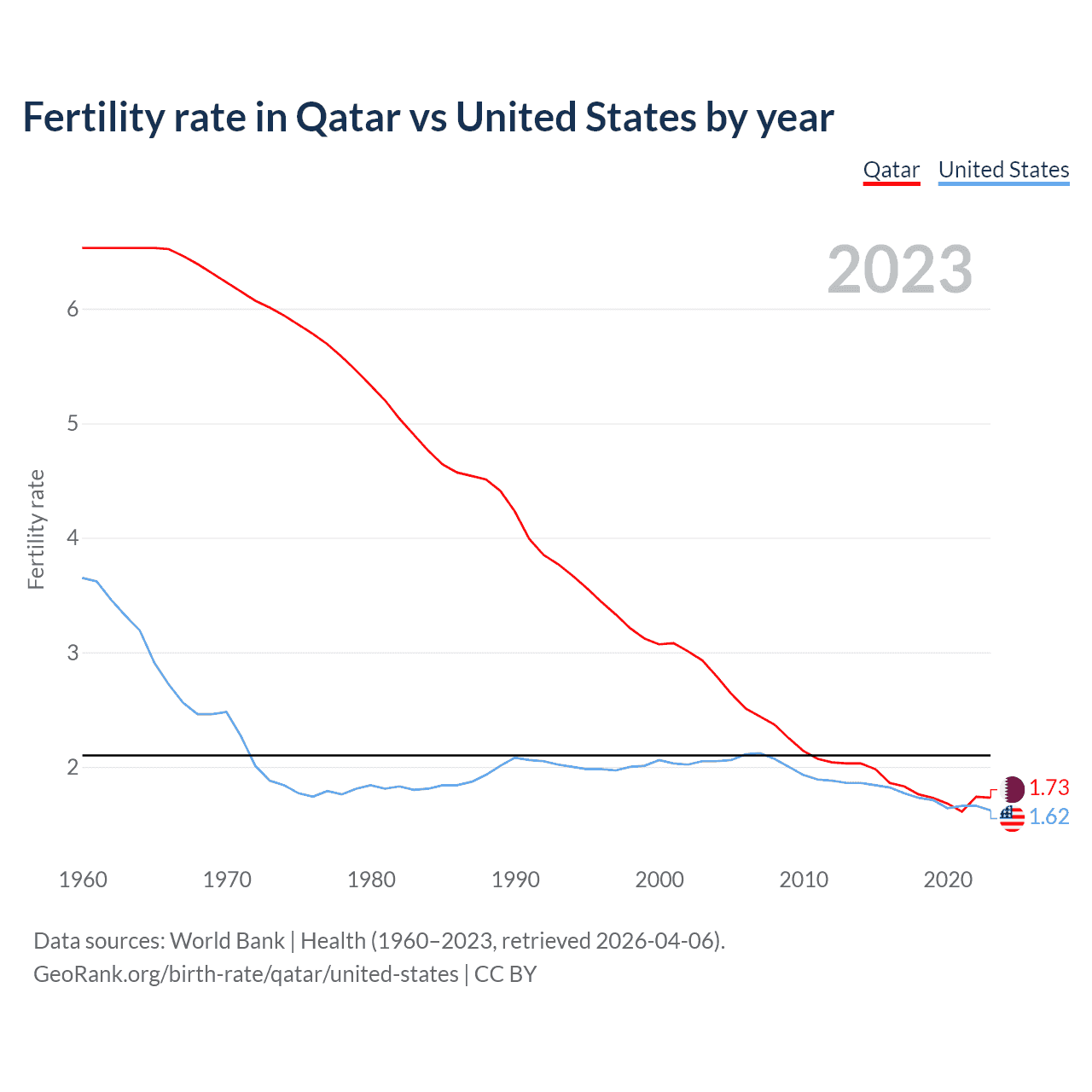 1960 vs 2023, the fertility rate has decreased by 73.5% in Qatar and by 55.8% in the United States — in 1960, it was 6.53 and 3.65, respectively.