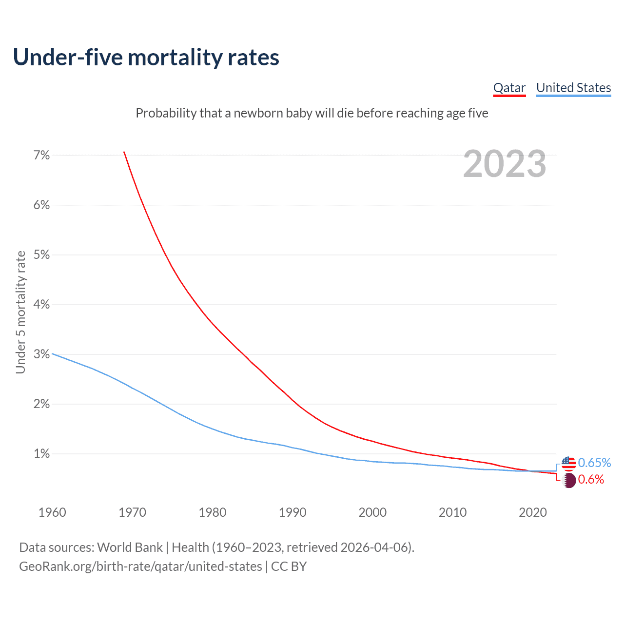 The chance that a newborn baby will die before reaching age five is 0.6% in Qatar and 0.65% in the United States. Above is a chart with historical data on under-five mortality rates.