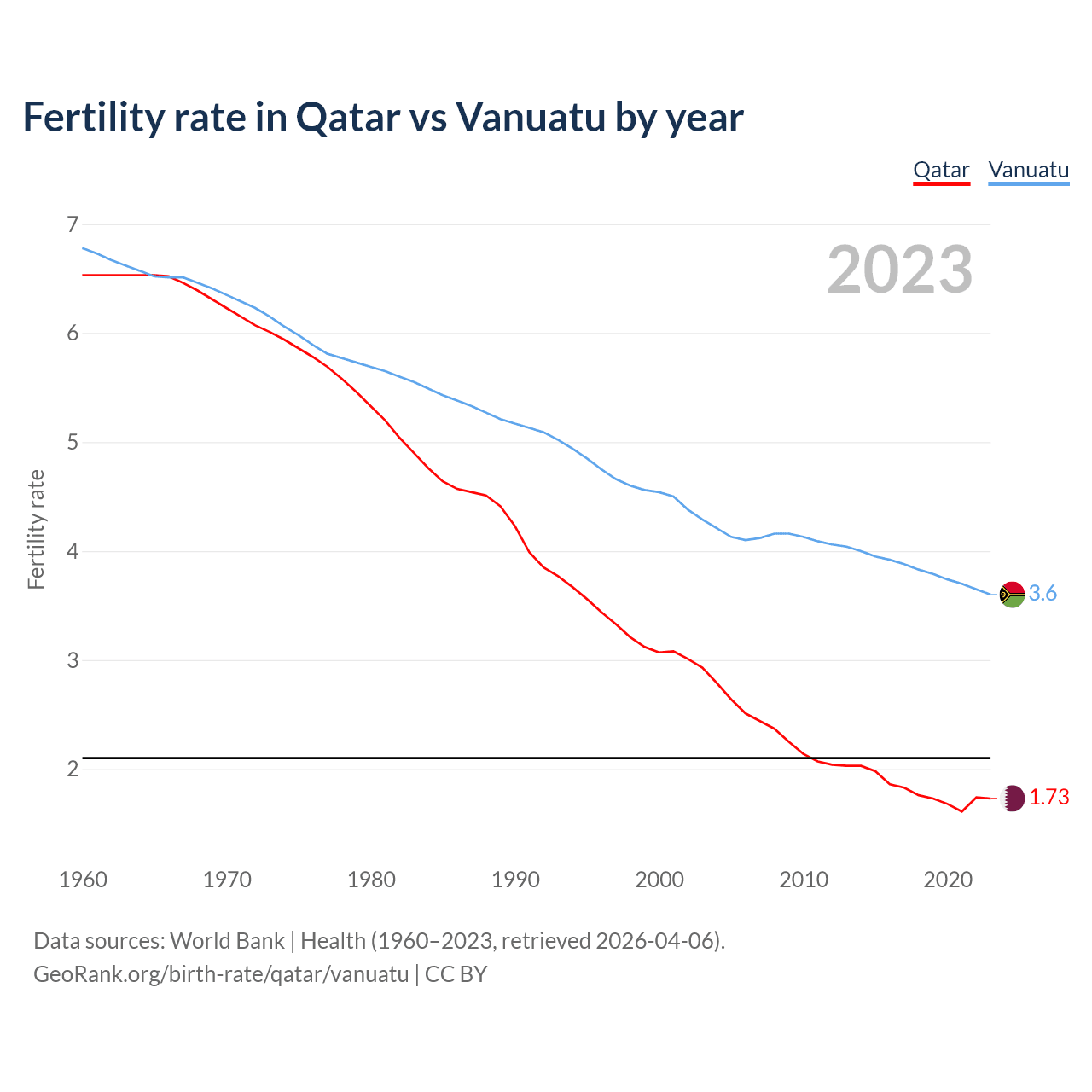 According to the latest available data on birth rates, the fertility rate in Qatar was 1.73 children per woman in 2023, compared to 3.6 in Vanuatu in 2023. The replacement level is considered to be 2.1 children per woman.