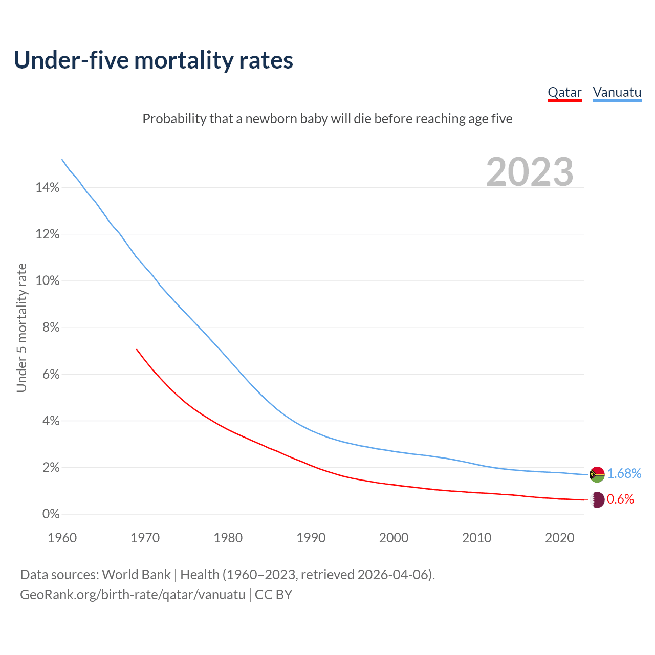 The chance that a newborn baby will die before reaching age five is 0.6% in Qatar and 1.68% in Vanuatu. Above is a chart with historical data on under-five mortality rates.