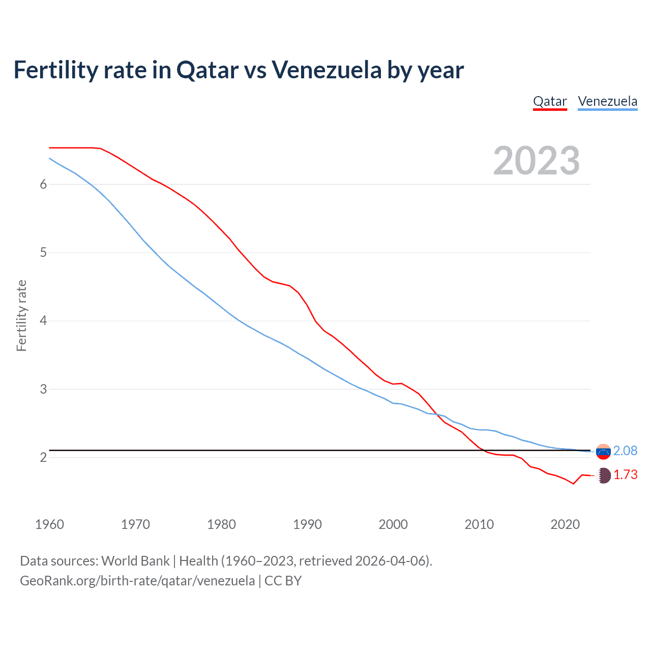 1960 vs 2023, the fertility rate has decreased by 73.5% in Qatar and by 67.4% in Venezuela — in 1960, it was 6.53 and 6.38, respectively.