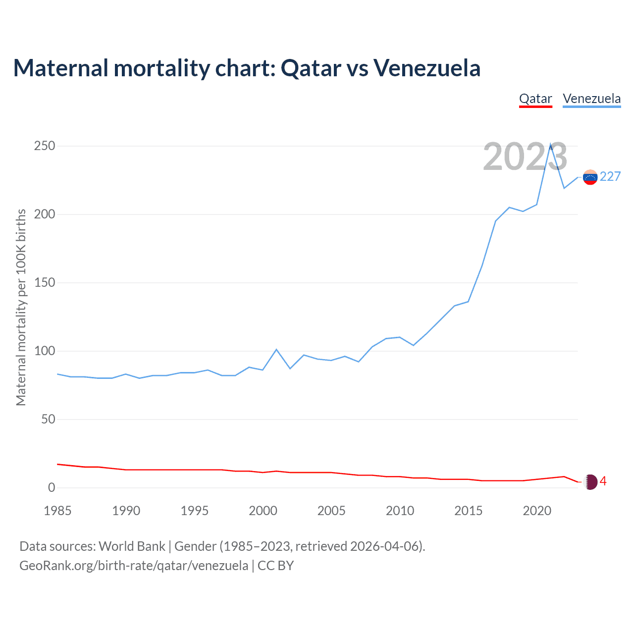 The maternal mortality rate, which is the probability of dying during childbirth or within 42 days of pregnancy termination, is 4 deaths per 100,000 live births in Qatar, compared to 227 deaths in Venezuela.