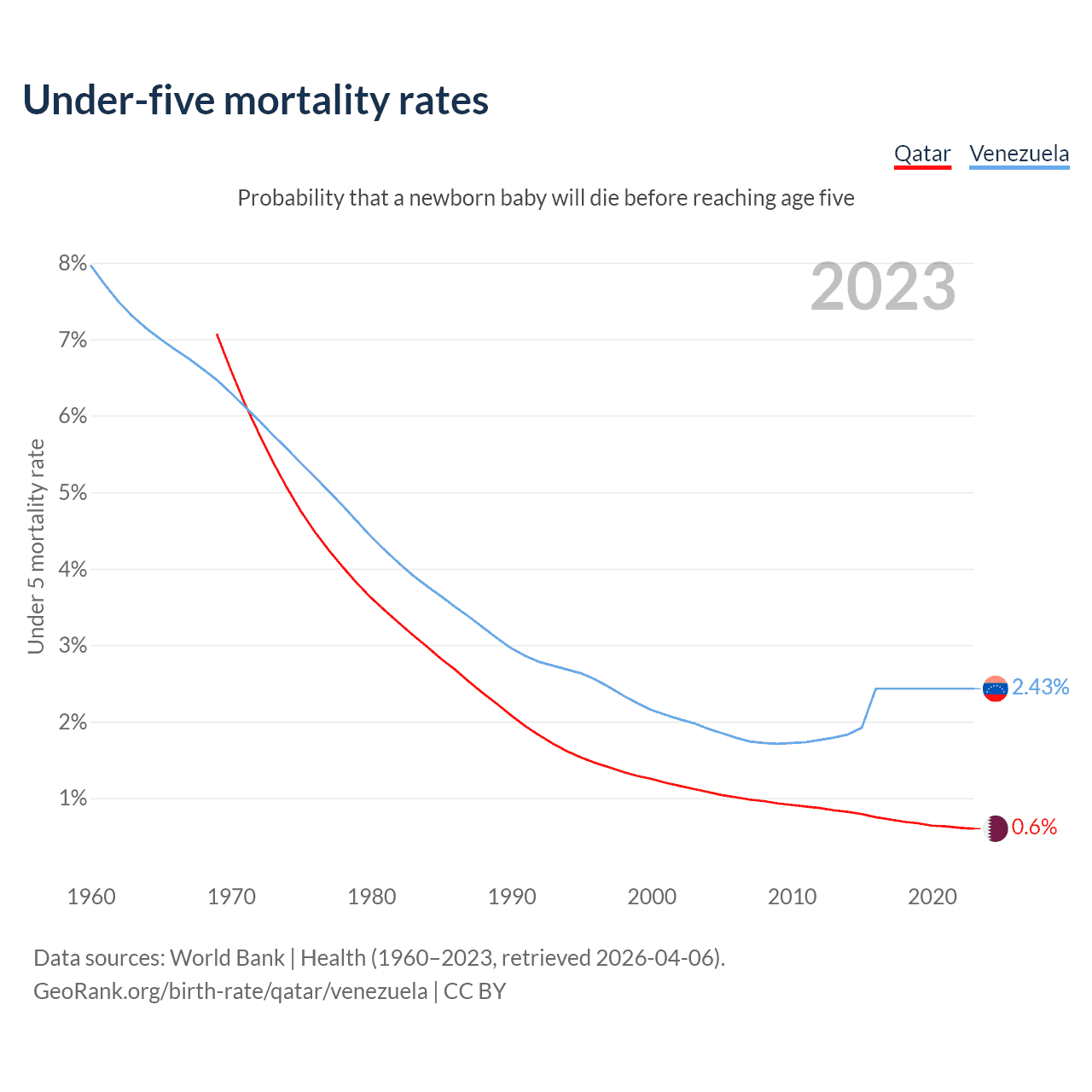The chance that a newborn baby will die before reaching age five is 0.6% in Qatar and 2.43% in Venezuela. Above is a chart with historical data on under-five mortality rates.