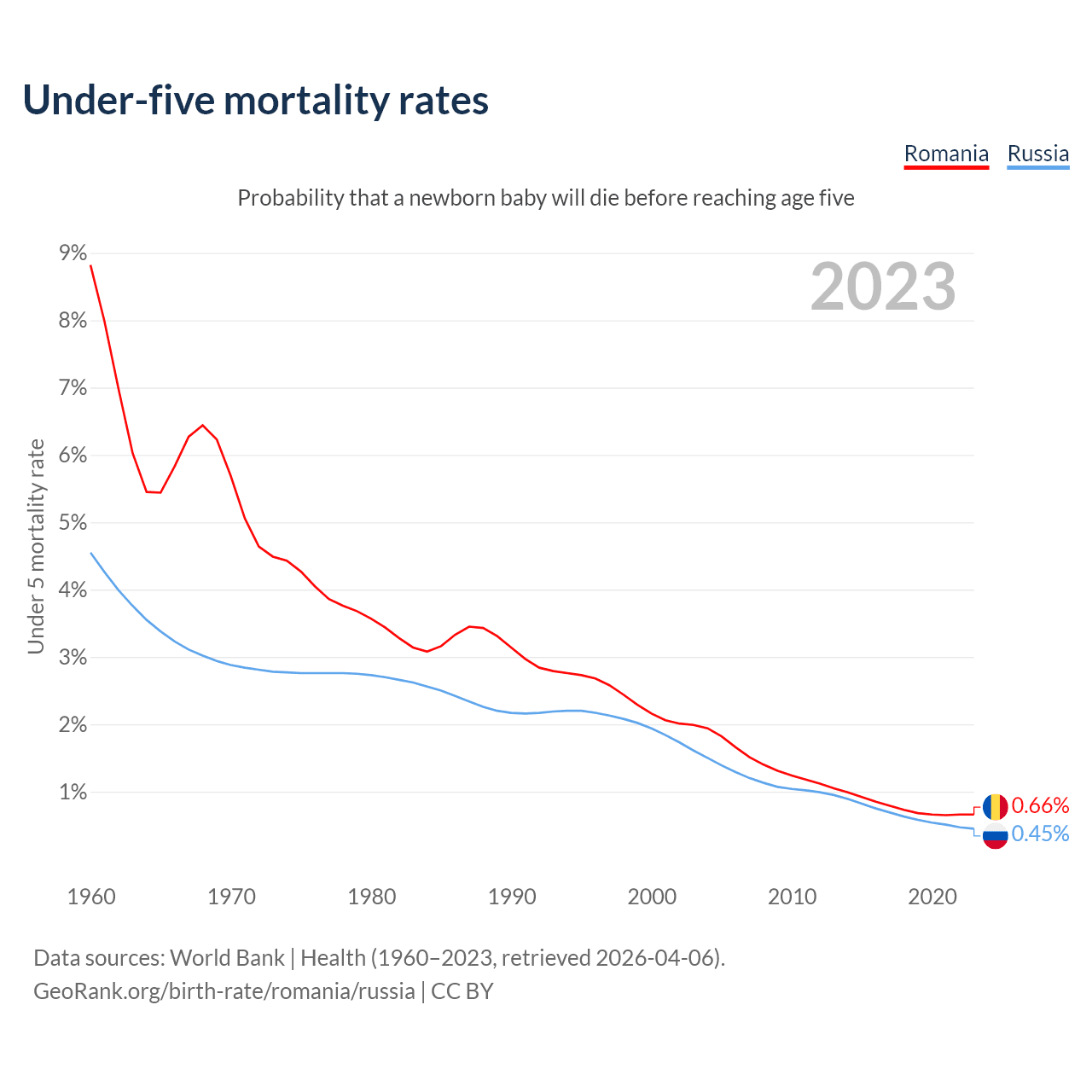 The chance that a newborn baby will die before reaching age five is 0.66% in Romania and 0.45% in Russia. Above is a chart with historical data on under-five mortality rates.