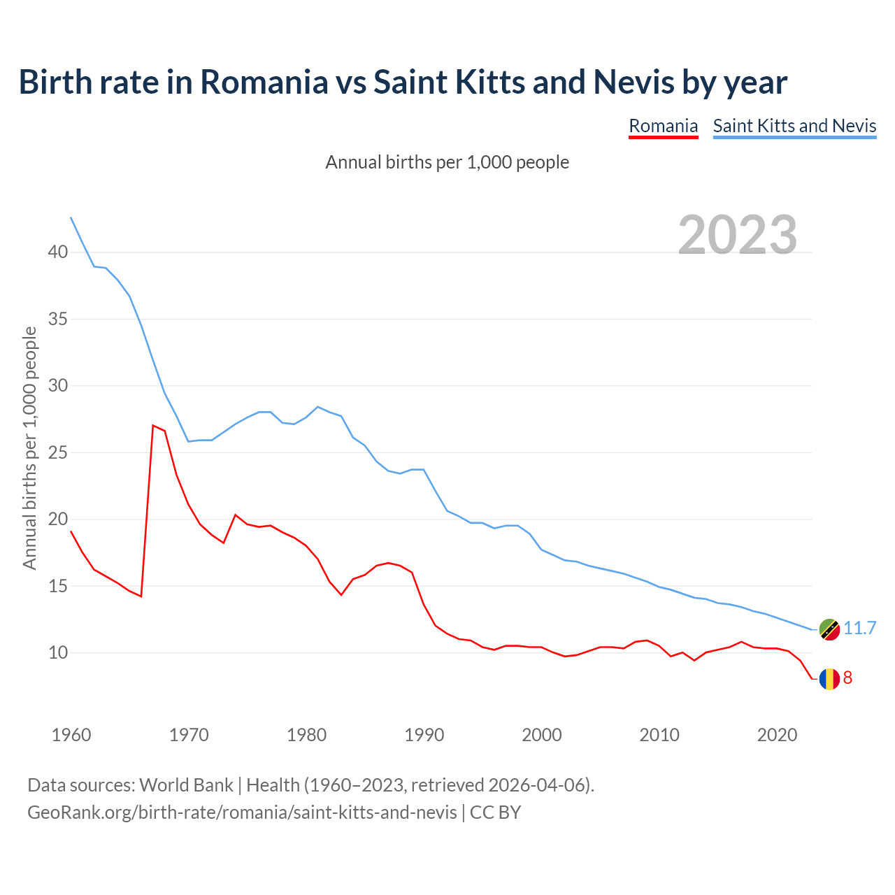 Romania has an annual birth rate of 8 births per 1,000 people, compared to 11.7 for Saint Kitts and Nevis. The average number of children a woman is expected to have during her lifetime — the fertility rate, is 1.71 in Romania and 1.51 in Saint Kitts and Nevis — 12% difference.