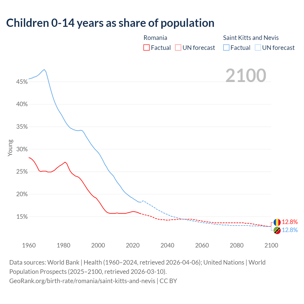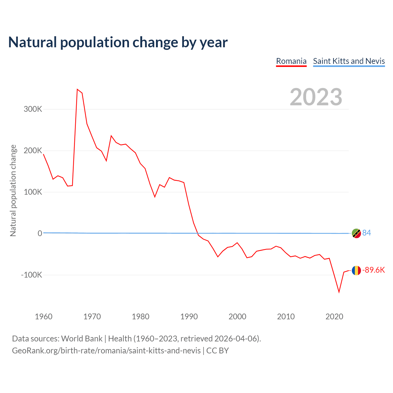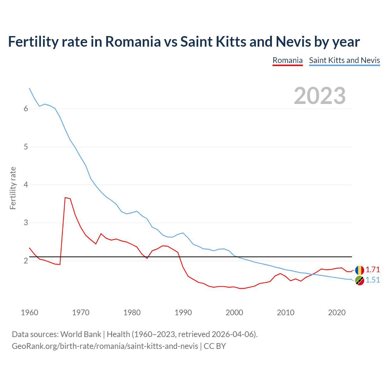 According to the latest available data on birth rates, the fertility rate in Romania was 1.71 children per woman in 2023, compared to 1.51 in Saint Kitts and Nevis in 2023. The replacement level is considered to be 2.1 children per woman.