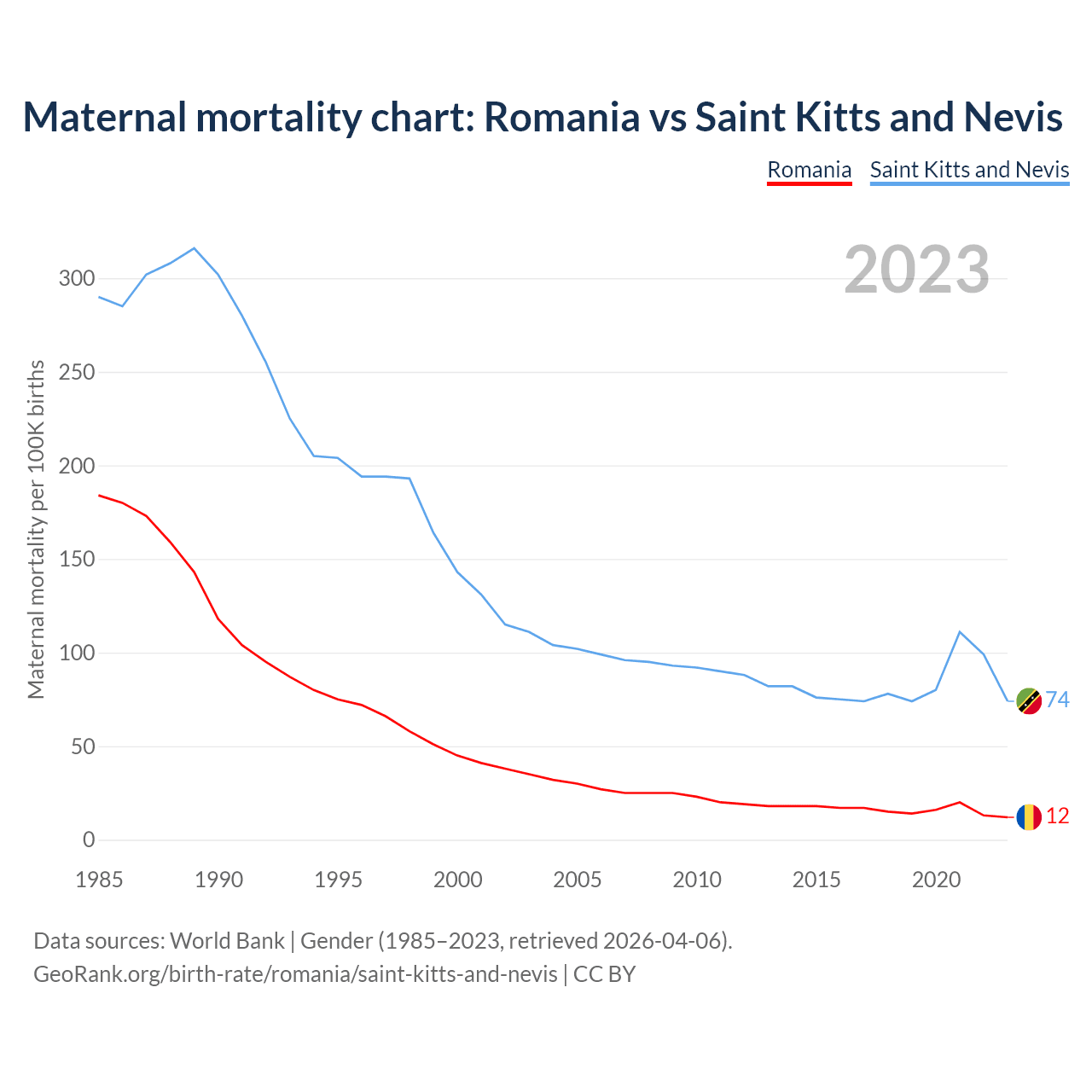 The maternal mortality rate, which is the probability of dying during childbirth or within 42 days of pregnancy termination, is 12 deaths per 100,000 live births in Romania, compared to 74 deaths in Saint Kitts and Nevis.