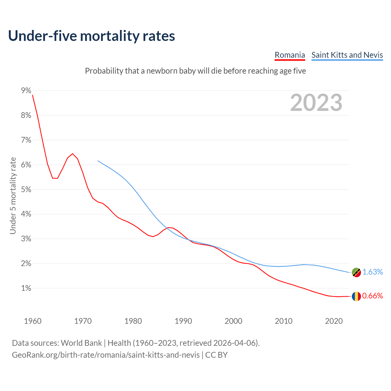 The chance that a newborn baby will die before reaching age five is 0.66% in Romania and 1.63% in Saint Kitts and Nevis. Above is a chart with historical data on under-five mortality rates.