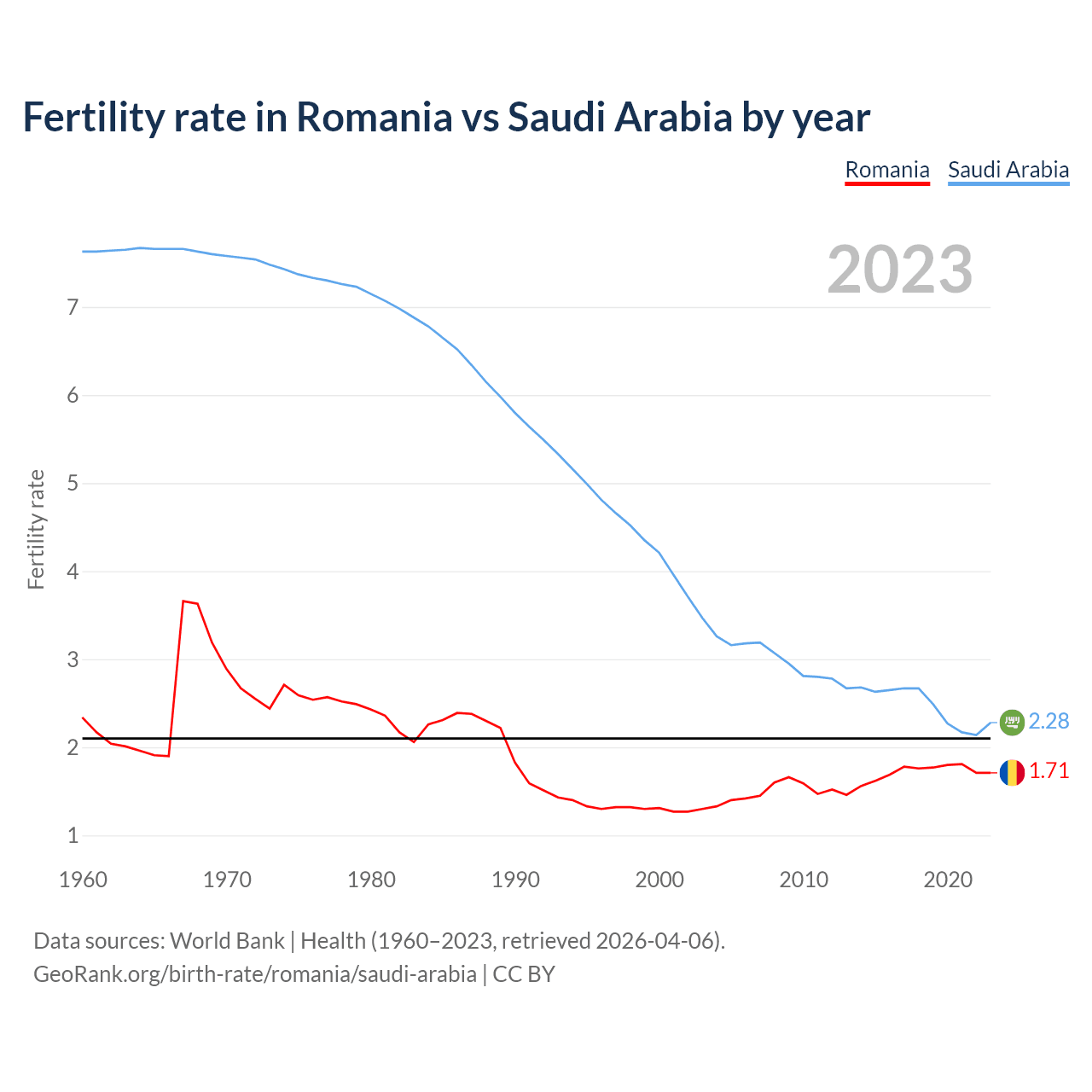 1960 vs 2023, the fertility rate has decreased by 26.9% in Romania and by 70.1% in Saudi Arabia — in 1960, it was 2.34 and 7.63, respectively.