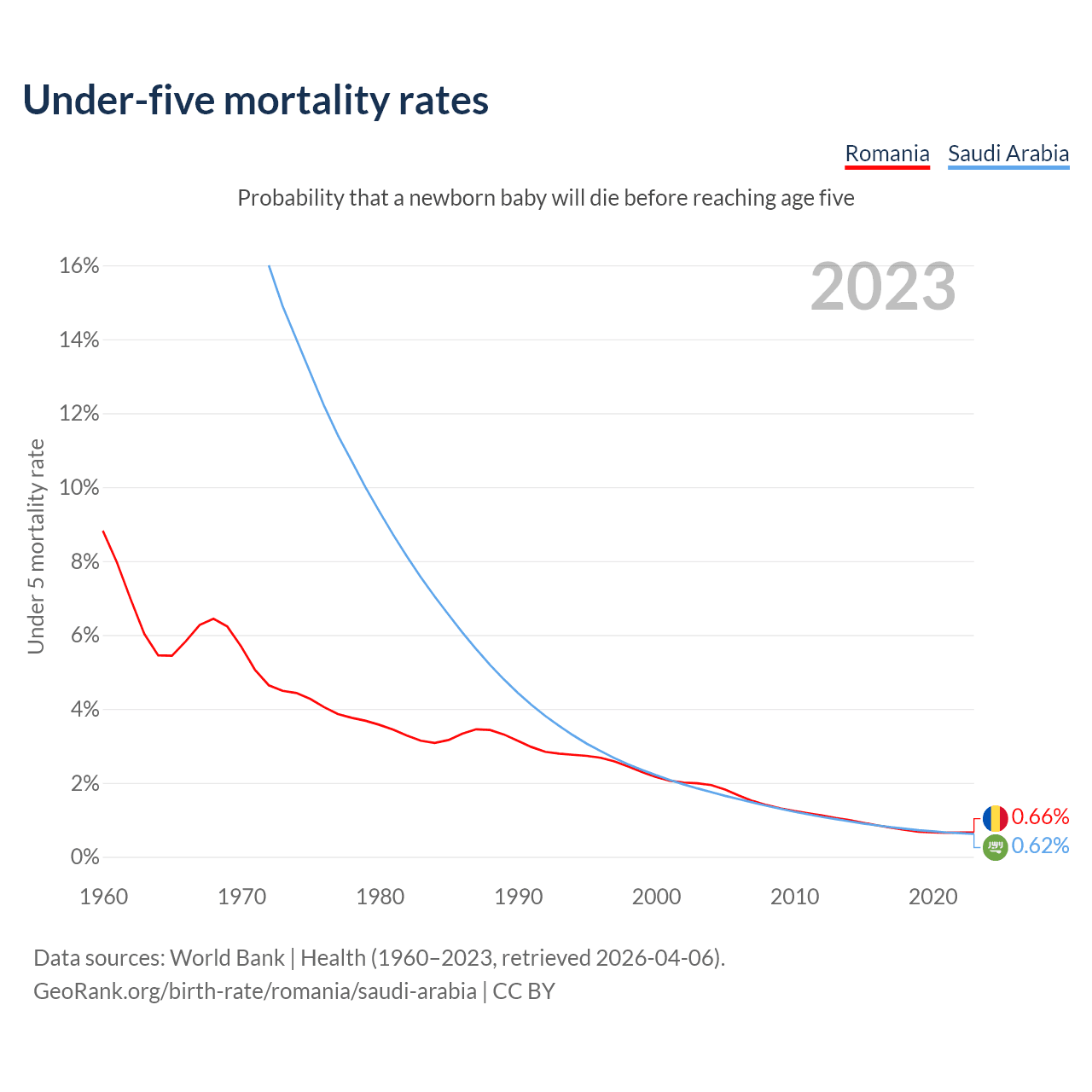 The chance that a newborn baby will die before reaching age five is 0.66% in Romania and 0.62% in Saudi Arabia. Above is a chart with historical data on under-five mortality rates.
