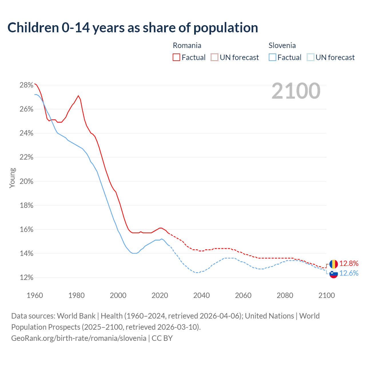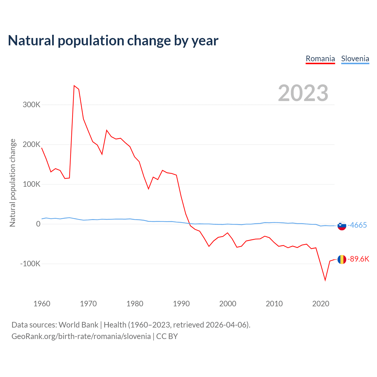 According to the latest available data on birth rates, the fertility rate in Romania was 1.71 children per woman in 2023, compared to 1.51 in Slovenia in 2023. The replacement level is considered to be 2.1 children per woman.