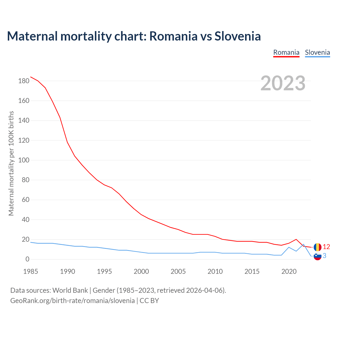 The maternal mortality rate, which is the probability of dying during childbirth or within 42 days of pregnancy termination, is 12 deaths per 100,000 live births in Romania, compared to 3 deaths in Slovenia.