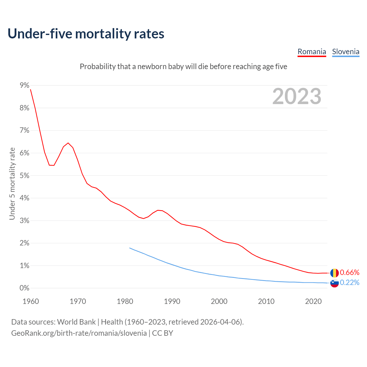 The chance that a newborn baby will die before reaching age five is 0.66% in Romania and 0.22% in Slovenia. Above is a chart with historical data on under-five mortality rates.