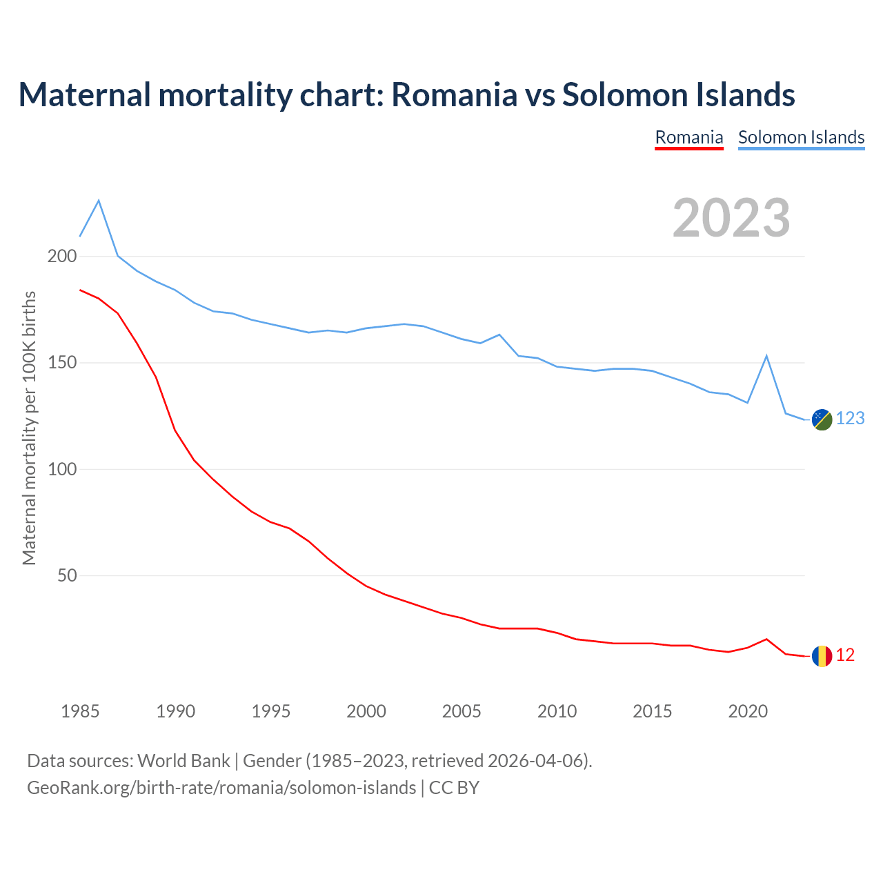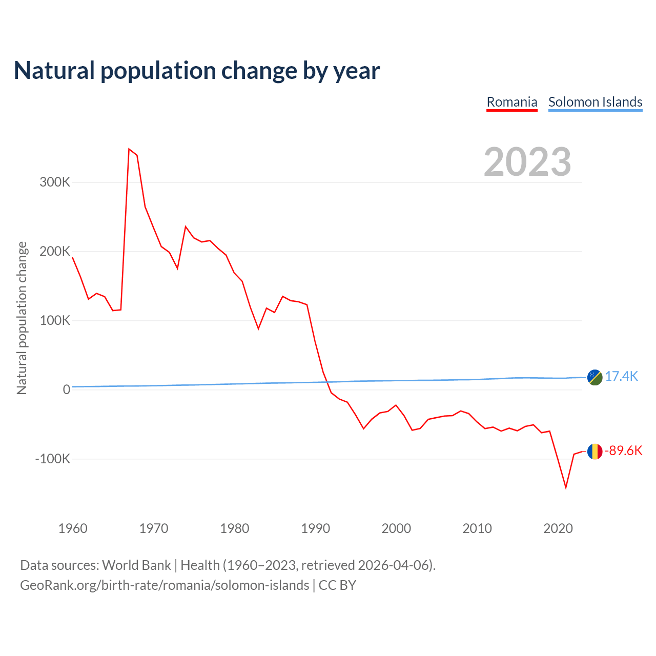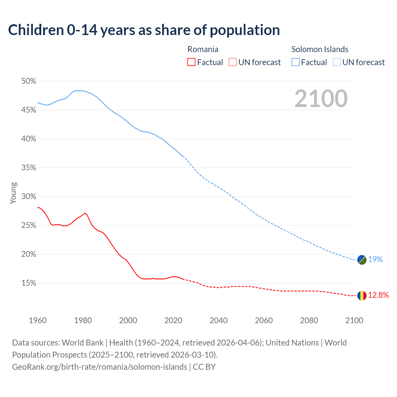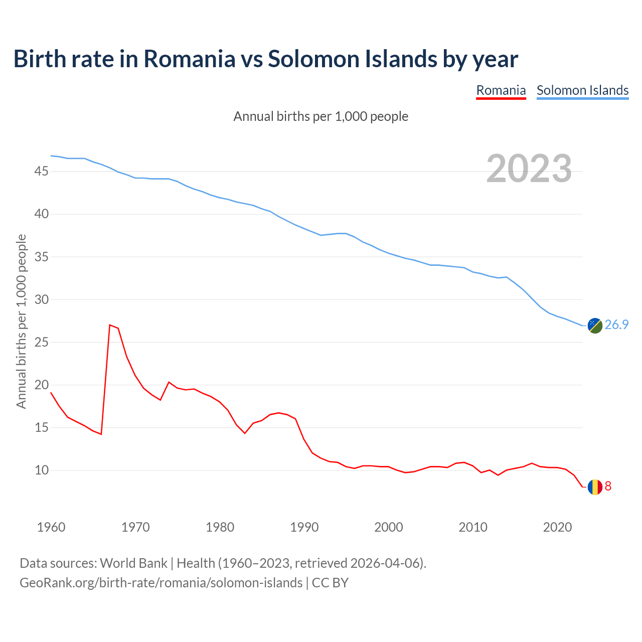 Romania has an annual birth rate of 8 births per 1,000 people, compared to 26.9 for the Solomon Islands. The average number of children a woman is expected to have during her lifetime — the fertility rate, is 1.71 in Romania and 3.56 in the Solomon Islands — 108% difference.