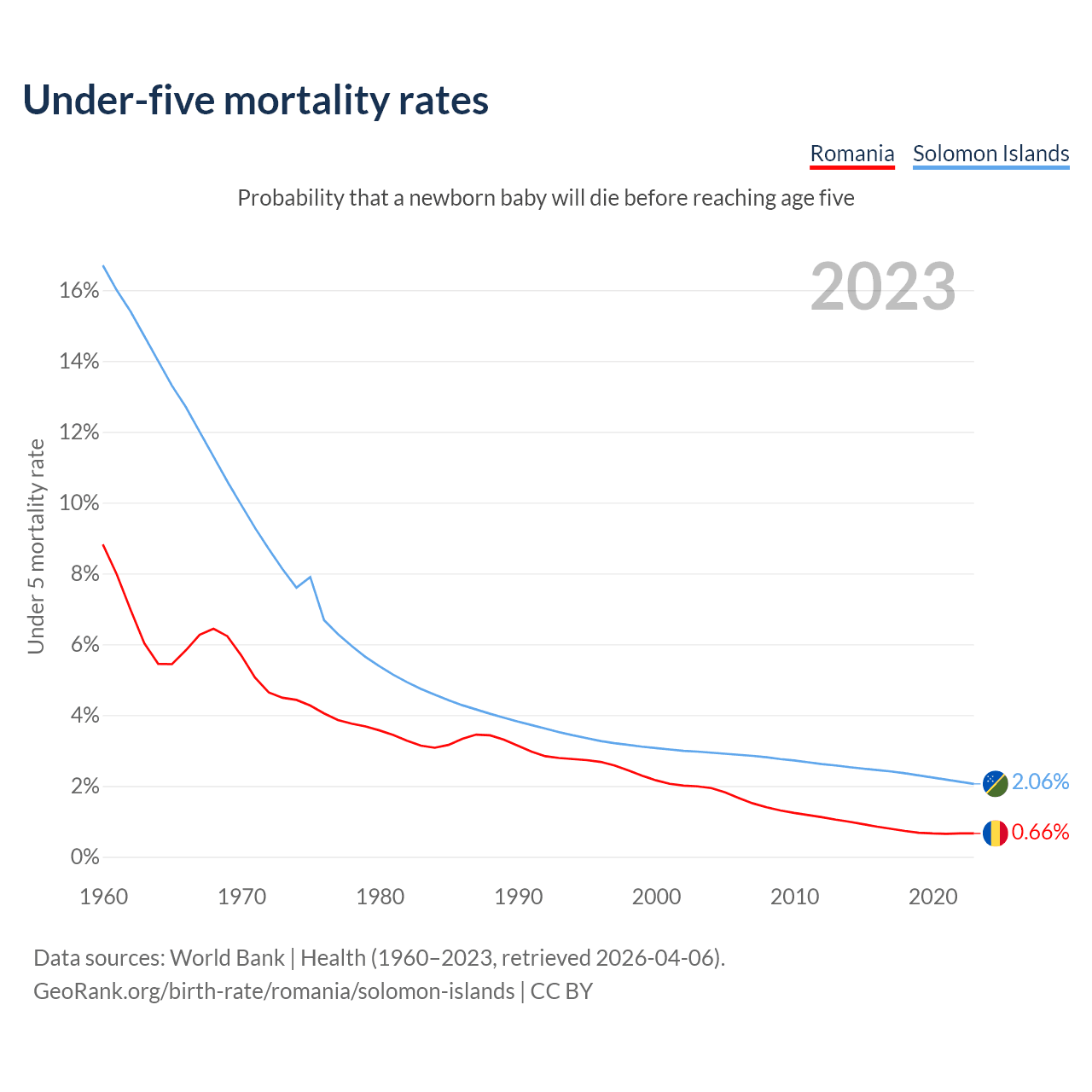 The chance that a newborn baby will die before reaching age five is 0.66% in Romania and 2.06% in the Solomon Islands. Above is a chart with historical data on under-five mortality rates.